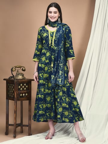 Women Liva Blue Floral Print Dress With Dupatta