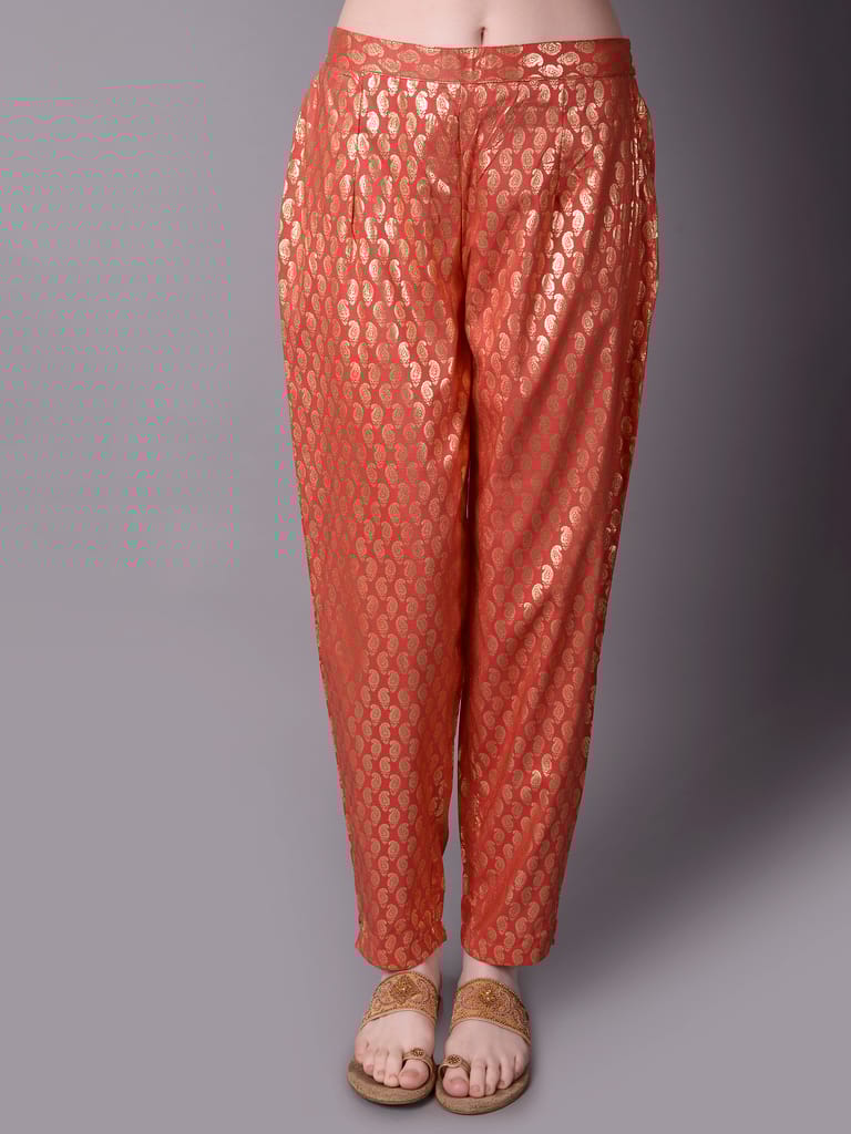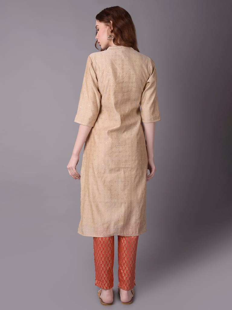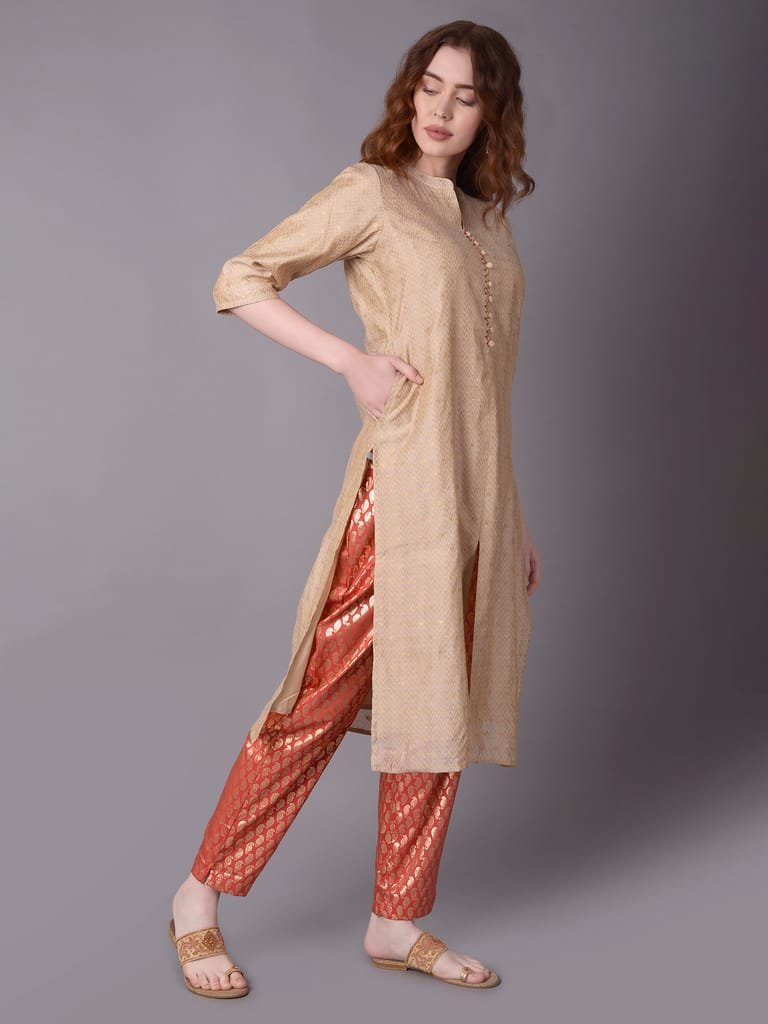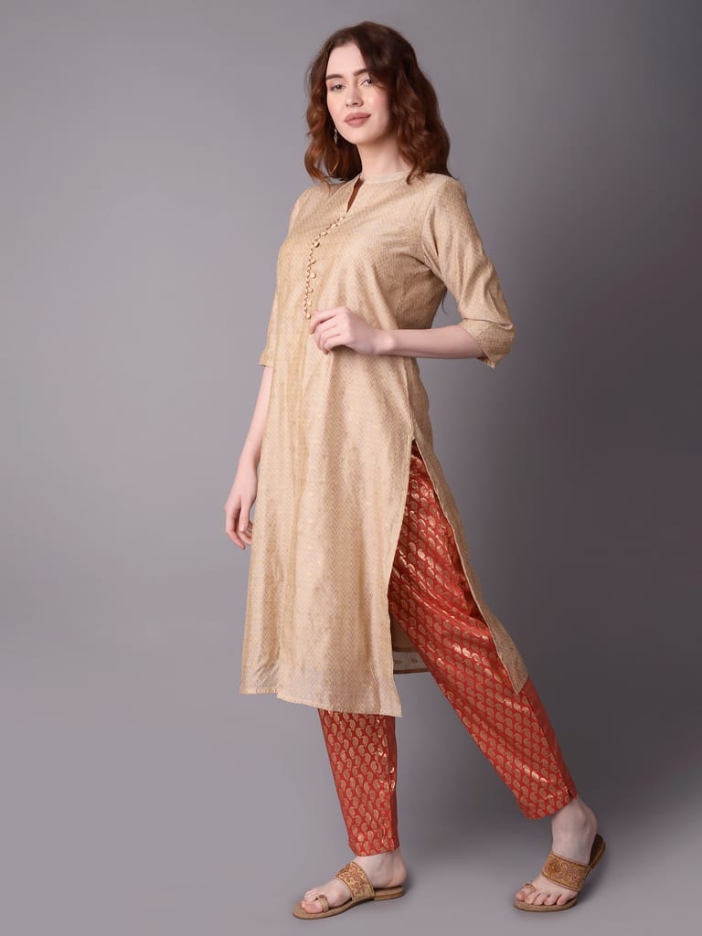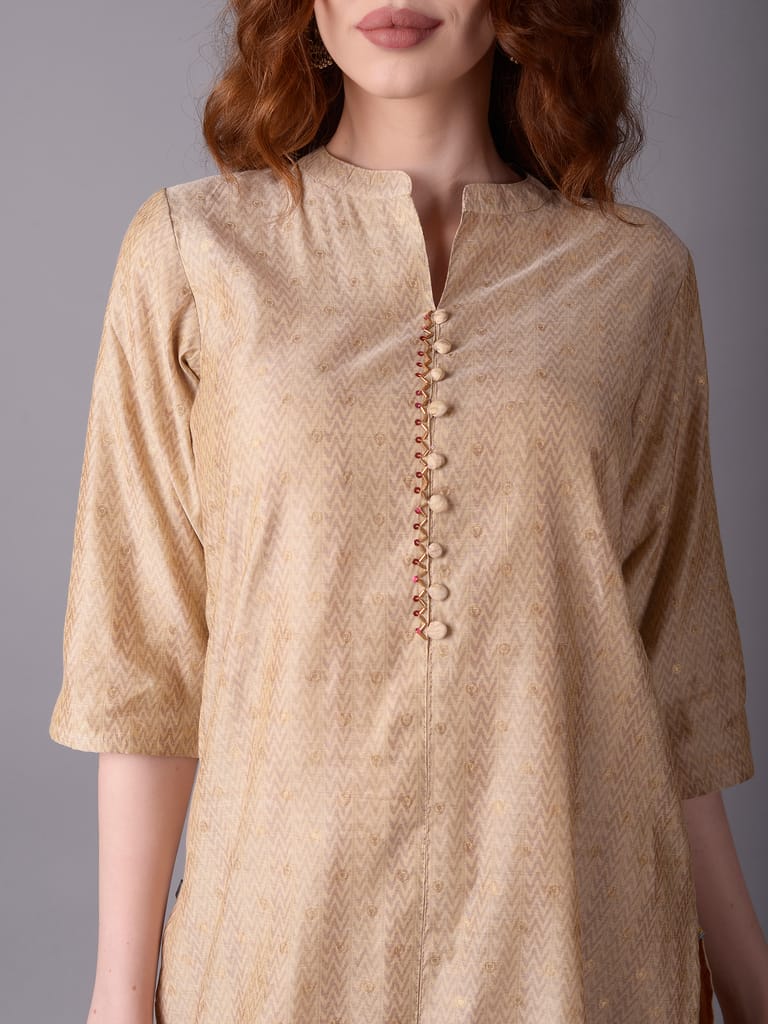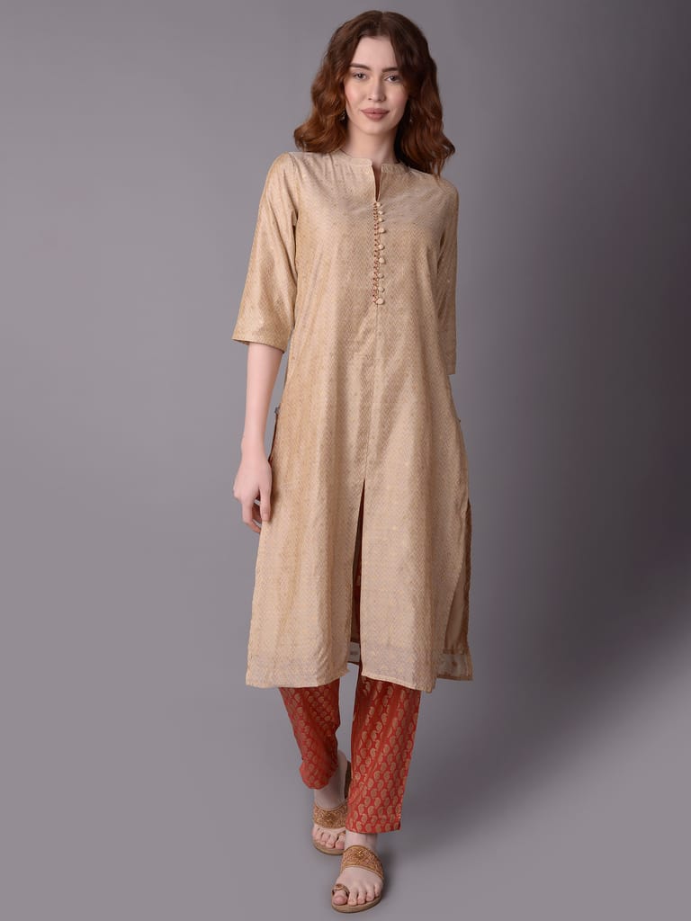If you are one of the few women who can effortlessly pull off an ethnic outfit or an off-white kurta, come visit Shree - She is Special. The off-white kurta has a straight fit hemline, a mandarin collar neckline with a sweet button-down design, and three-quarter sleeves, among other great characteristics. It is accompanied by a matching dupatta and a pair of decoratively printed pants. With this ethnic collection, you can accessorise your preferred accessories. Wear flats or chappals with this clothing as well. The side pocket on the kurta makes the garment more practical. In addition, the dupatta and the kurta are both constructed of chanderi cloth. The trousers, on the other hand, are composed of silk material. With this ethnic set from the "Kaashi" collection, let ornamental print define your sense of style. Buy today from Shree outlet in Dubai or make the purchase online!