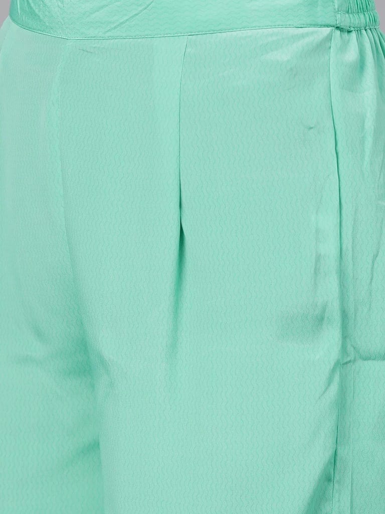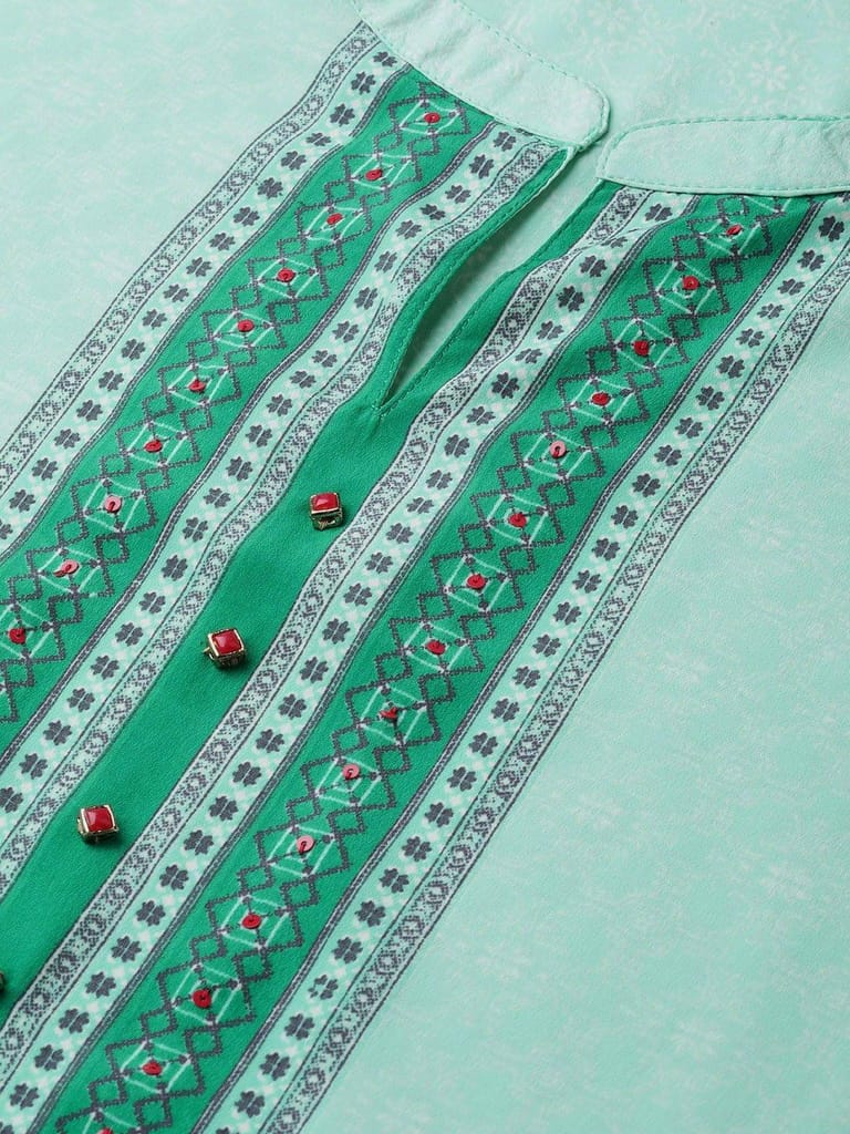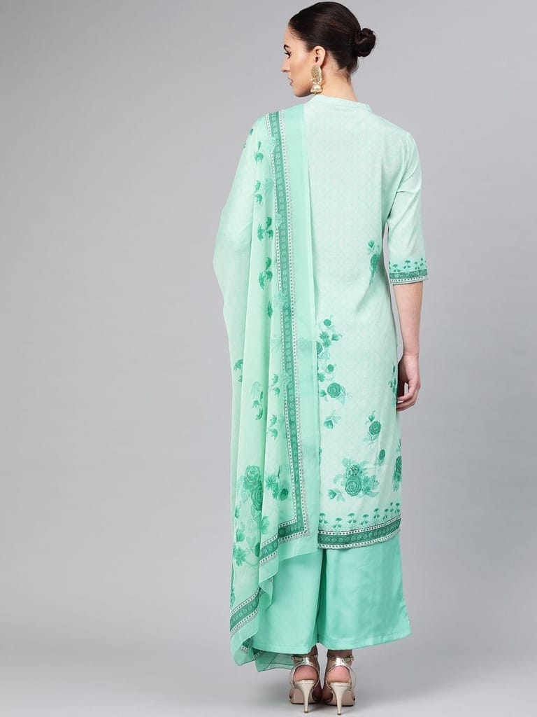 When you are wearing this floral print long kurta set by Shree, you don?t have to worry even if you have to head to a party right after your office! With palazzo pants that go perfectly with the beautiful kurta, this kurti pant set with dupatta is going to be your favourite! The pure cotton kurta with delicate floral prints has 3/4th sleeves and is knee-long, and the dupatta is flowy and soft - this attire is a perfect blend of simplicity and elegance. The stylish patterns at the neckline take the beauty of this outfit to a whole new level! 2237MPMINTGREEN