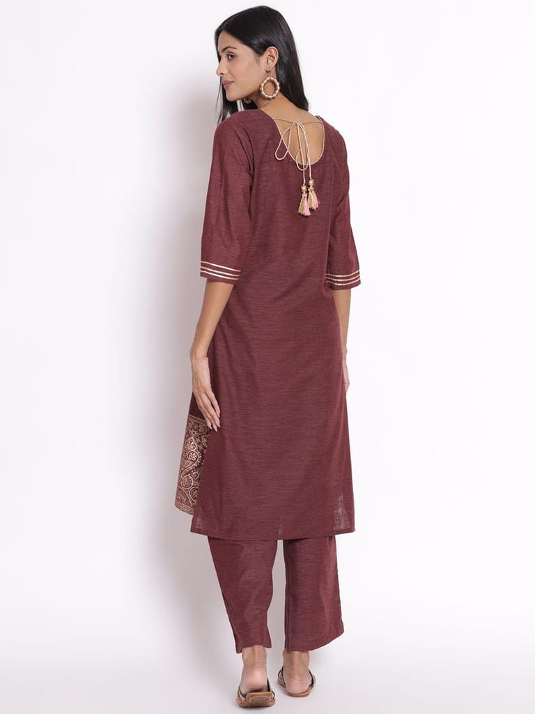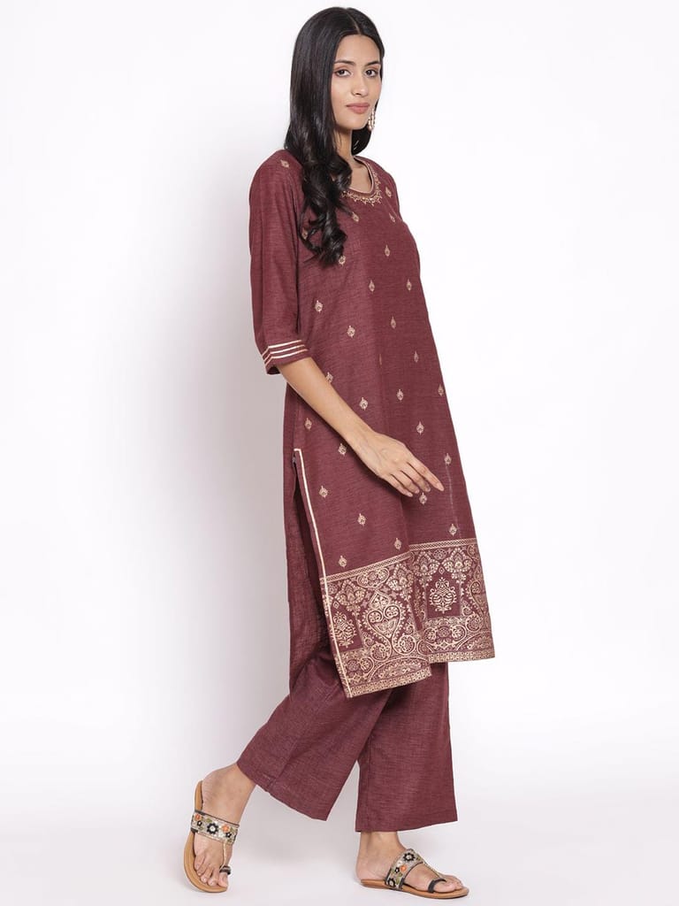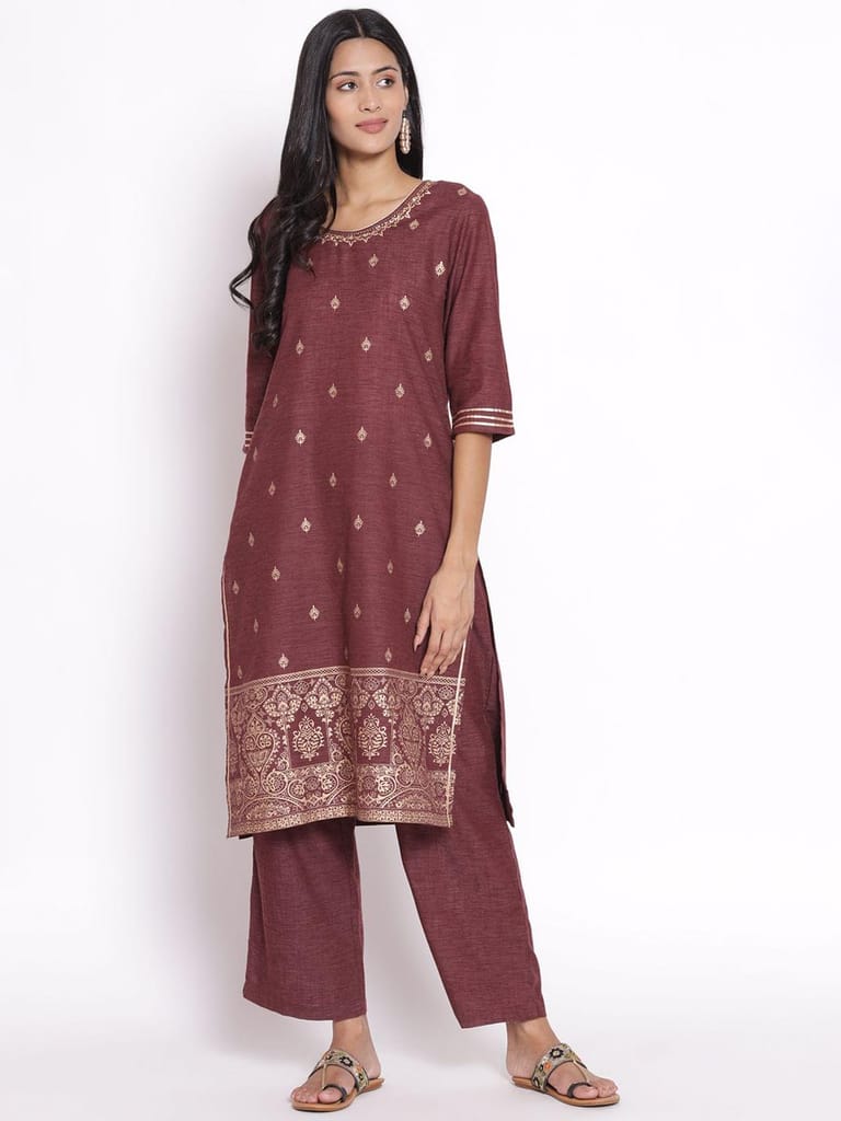 If you love wearing the color Burgundy, then we have just the outfit designed for you. Go for this charming burgundy ornamental printed kurta set from Shree and enjoy looking like a diva on any event or occasion. The ethnic set has a kurta which comes featured with a straight fit hem, a round neckline with a slight border, and ¾ sized sleeves with borders. This kurta comes adorned with ornamental print, which enhances its look further. It comes with a comfortable pair of pants and a digital printed dupatta. While the kurta and its pants are made of cotton fabric, the dupatta is made of poly chanderi fabric. So, shop now! 6975BURGUNDY