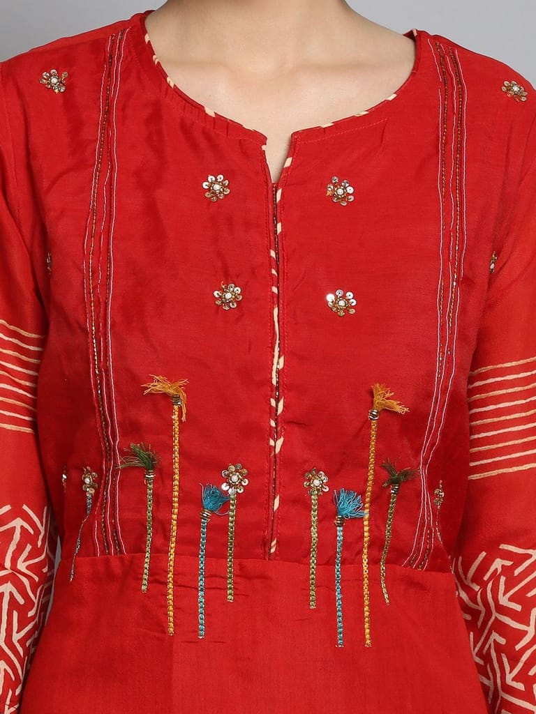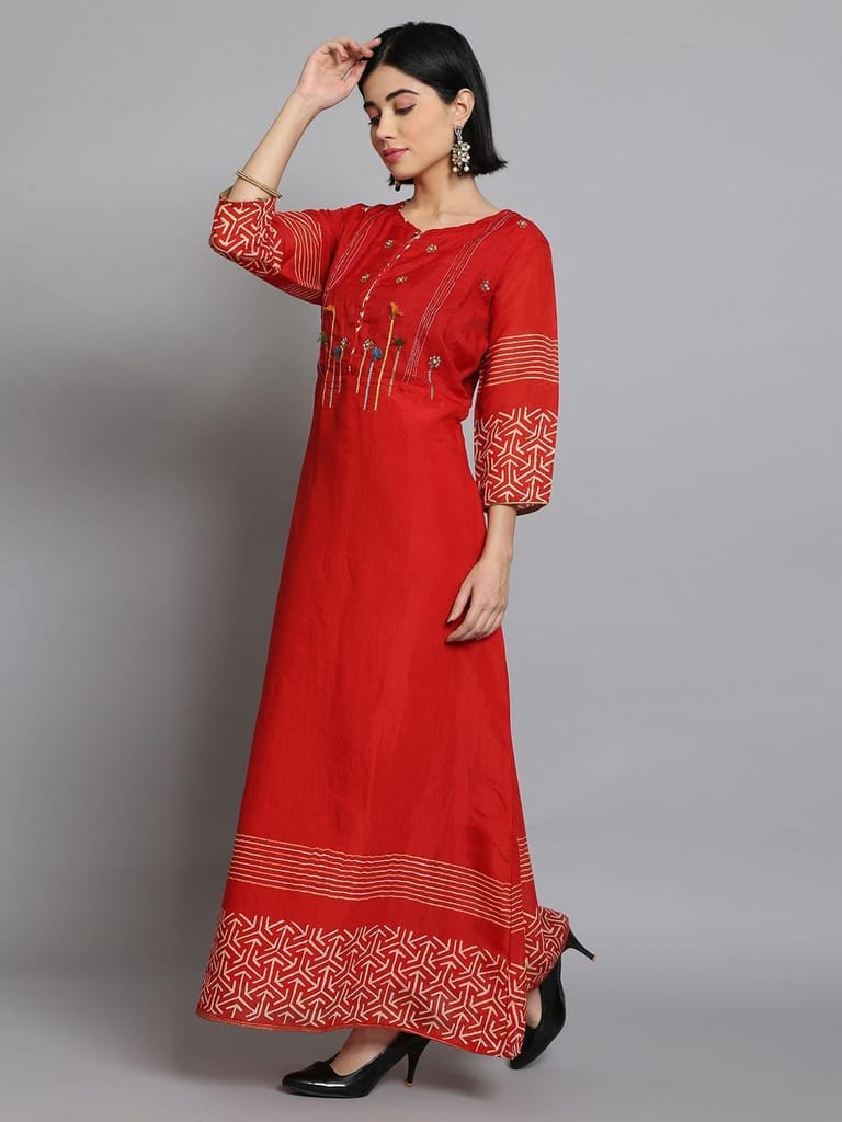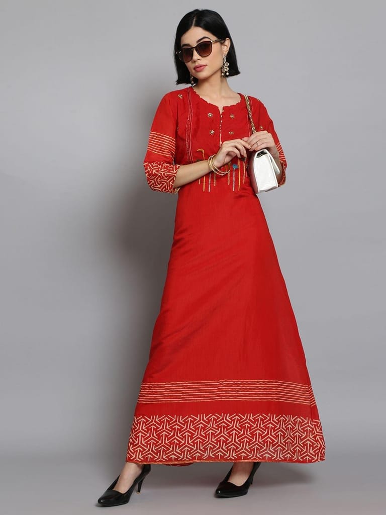 When the situation demands that you look beautiful, grand as well as sober, this ornamental women dress by Shree will come to your rescue. This gorgeous yet simple mustard color dress has beautiful but simple embroidered patterns at the waist and the chest, while some pretty geometric patterns at the sleeves and borders. With contrasting patterns and designs, this full length pure cotton attire is the best example of ethnic wear in a modern design. This outfit is ideal for everyday wear because of its simplicity, and also for special occasions because of its beautiful and unique design! Just pair with a grand jhumka and you are party-ready! 4408Red