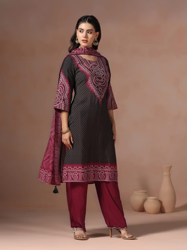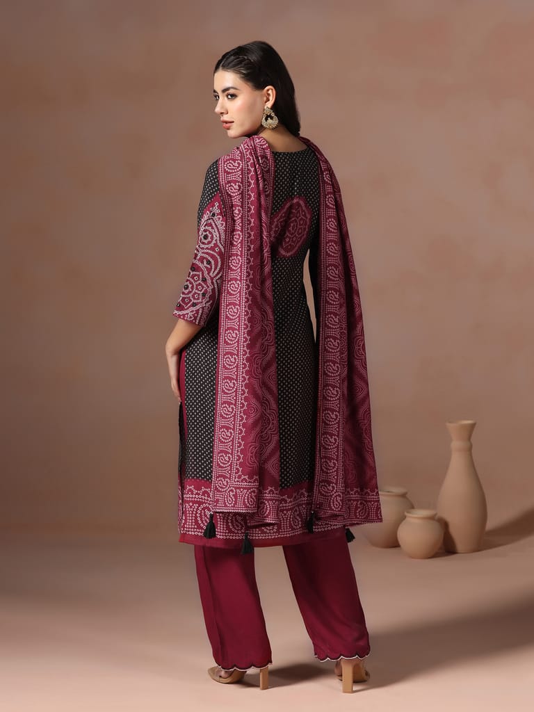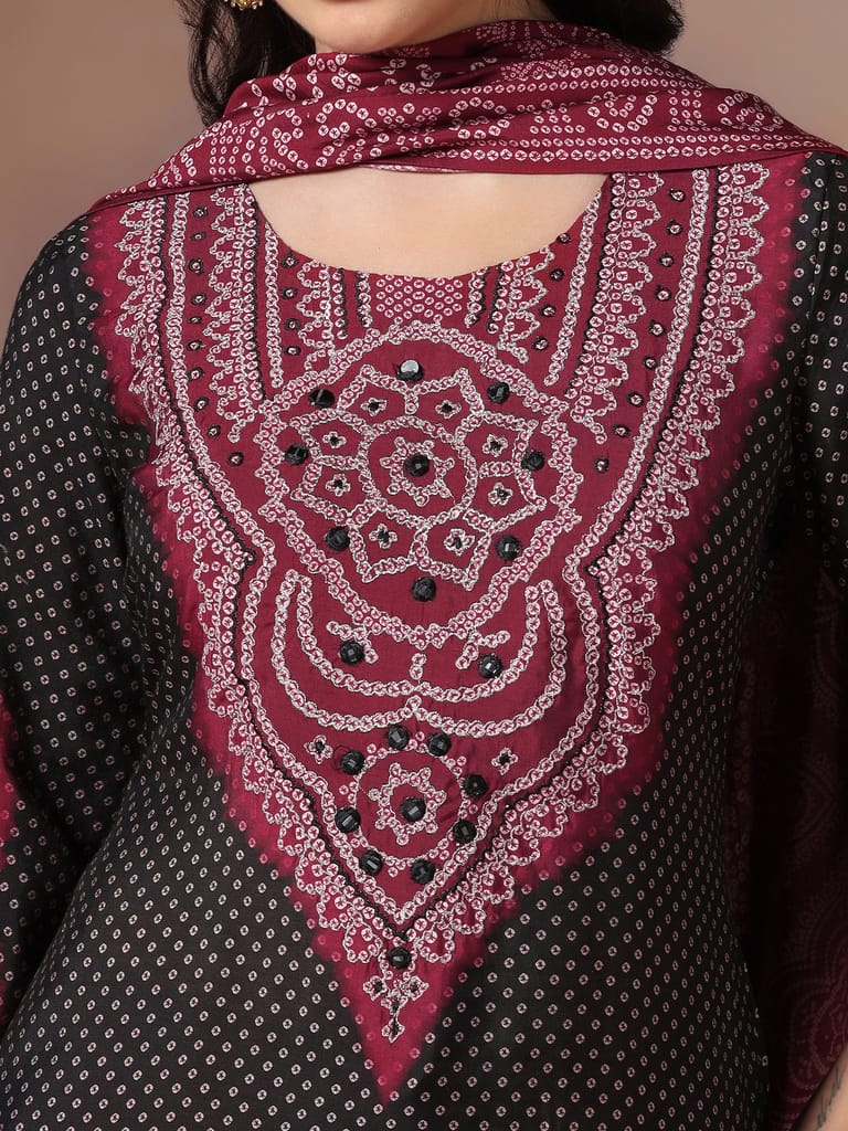 Women Chanderi Black Bandhani Print embroidered Kurta Comfort Pant Dupatta