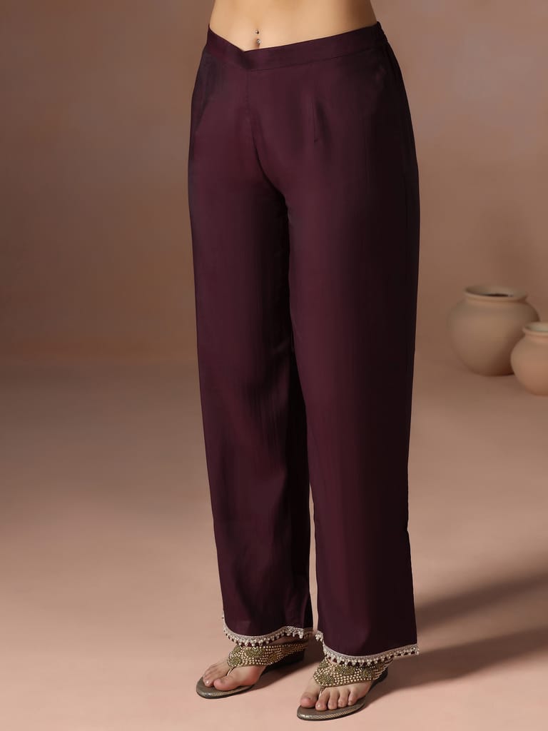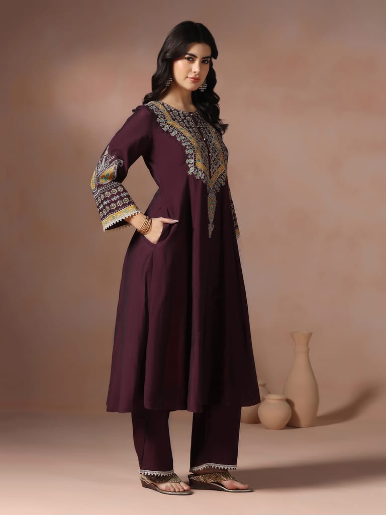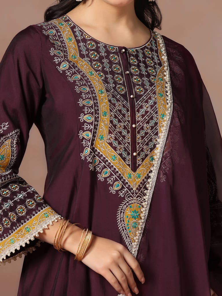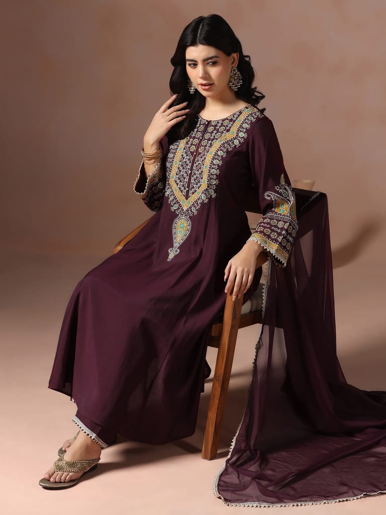 Women Chanderi Burgundy Embroidered Kurta Comfort Pant Dupatta