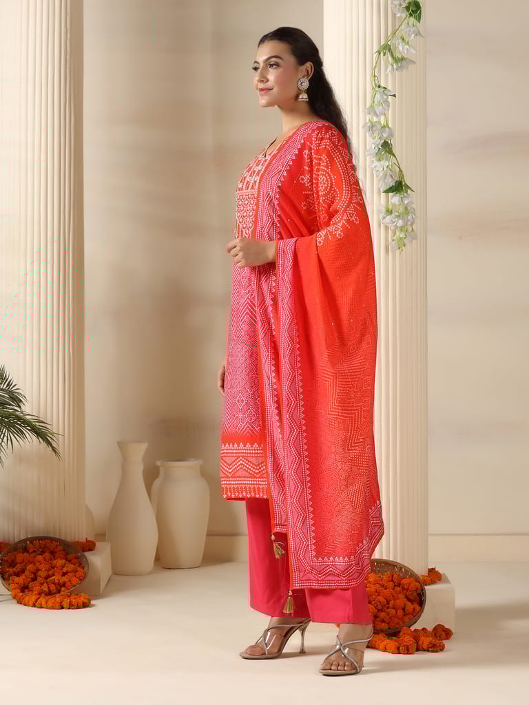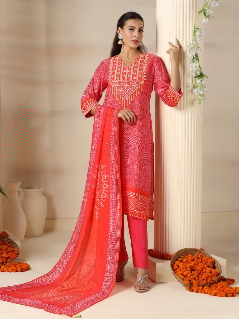 Women Chanderi Pink Bandhani Print embroidered Kurta Comfort Pant Dupatta