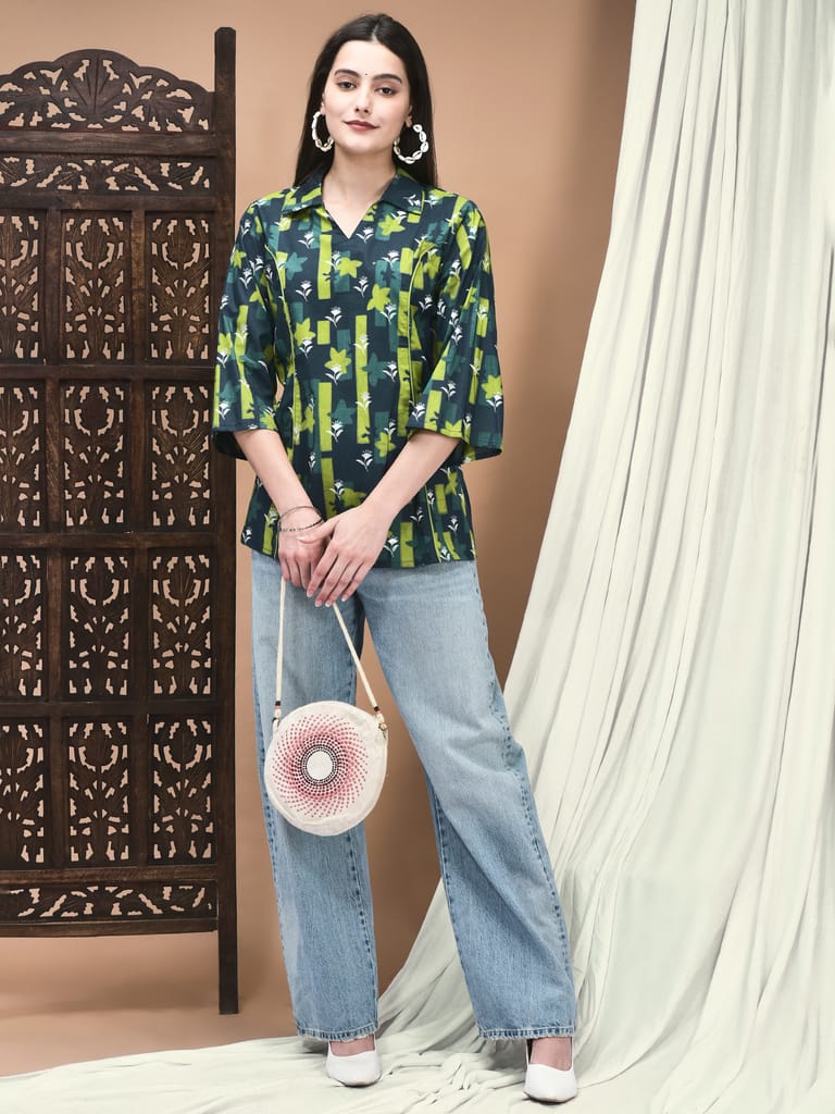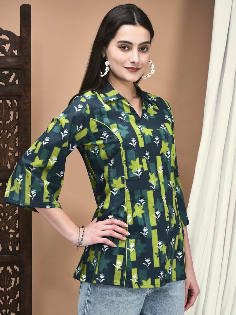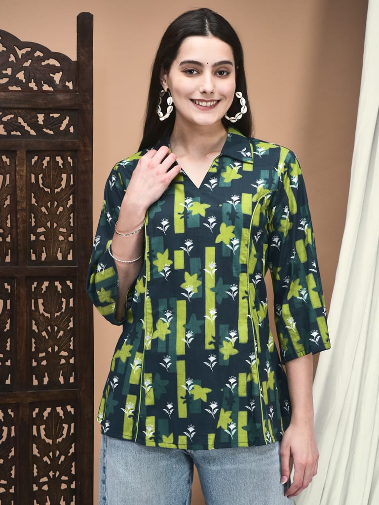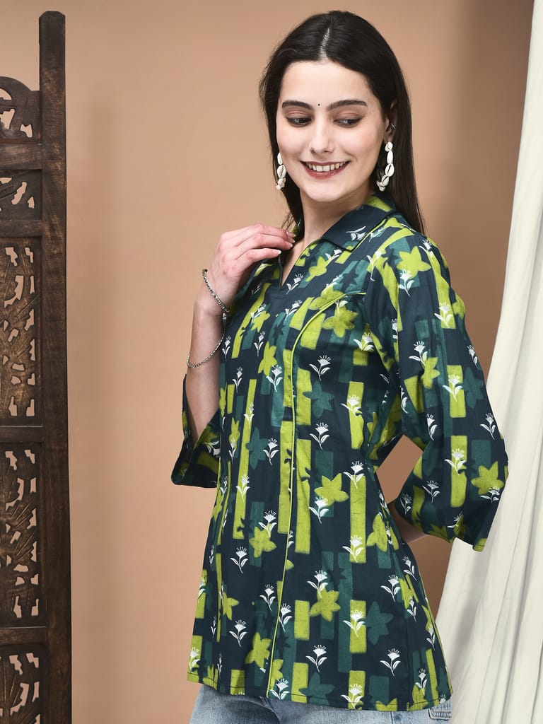 Women Cotton Green Floral Print Tunic