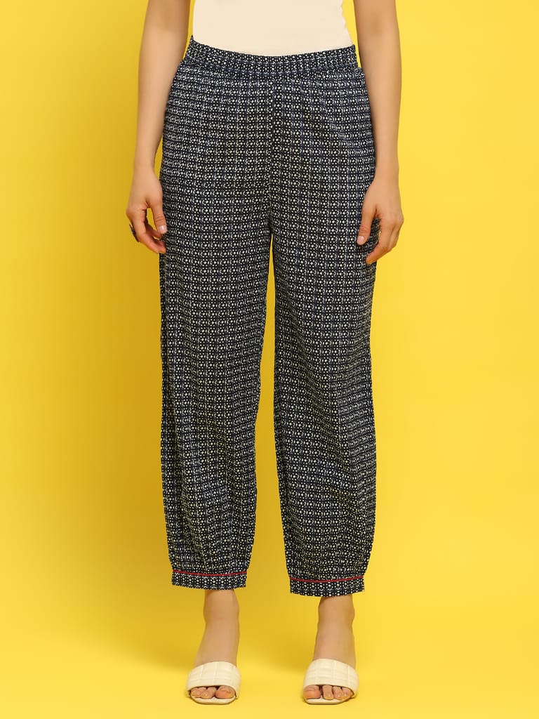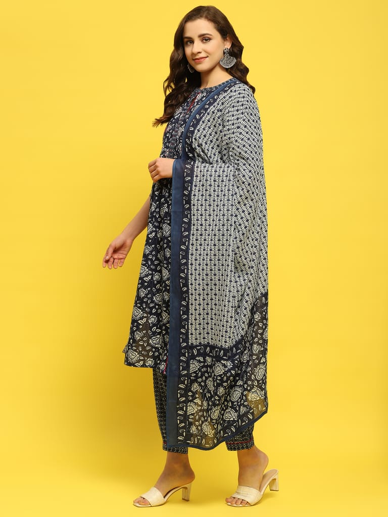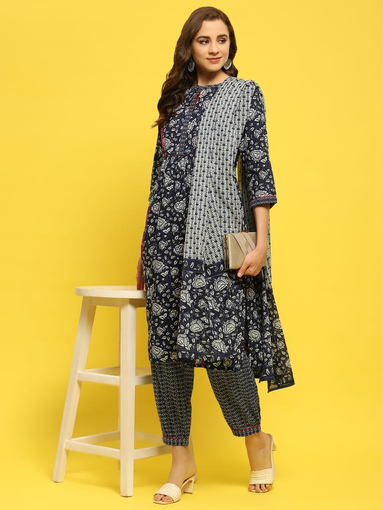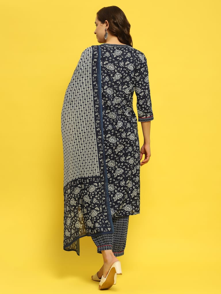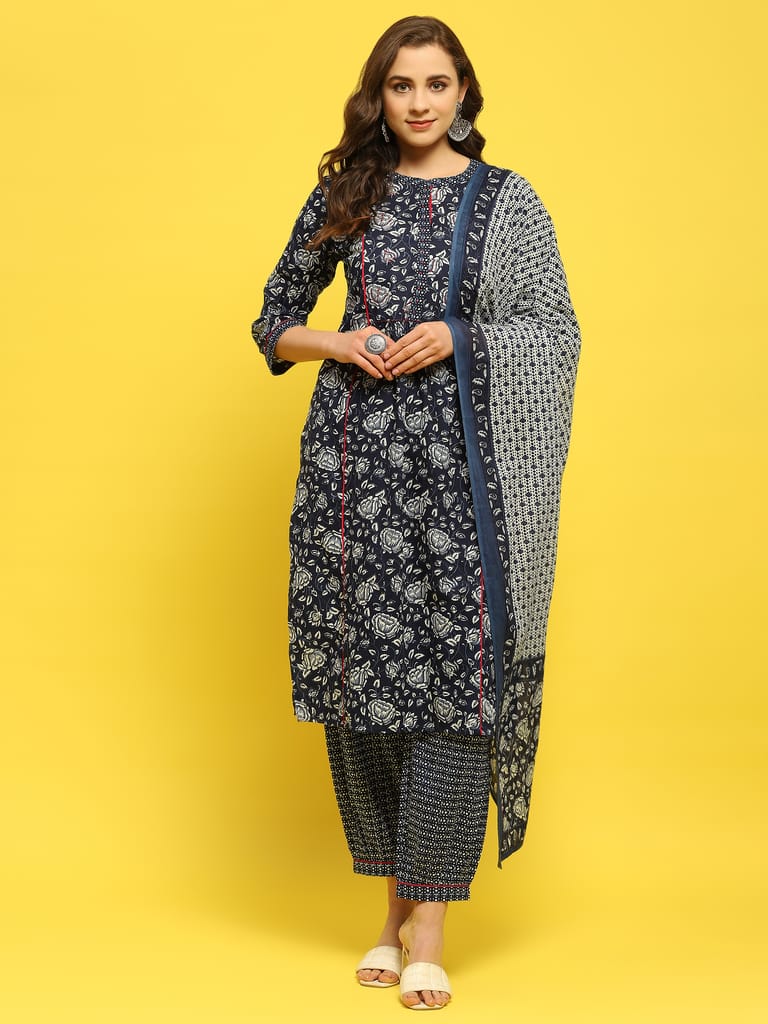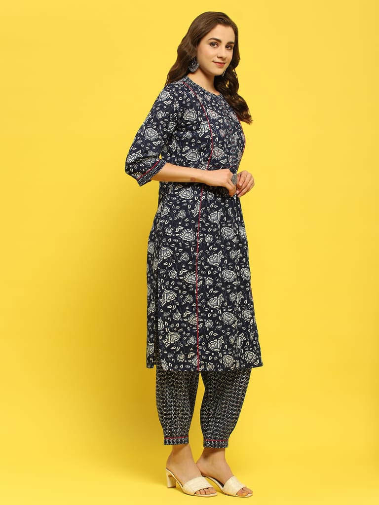 Women Cotton Indigo Floral Print Kurta Harem Pant Dupatta