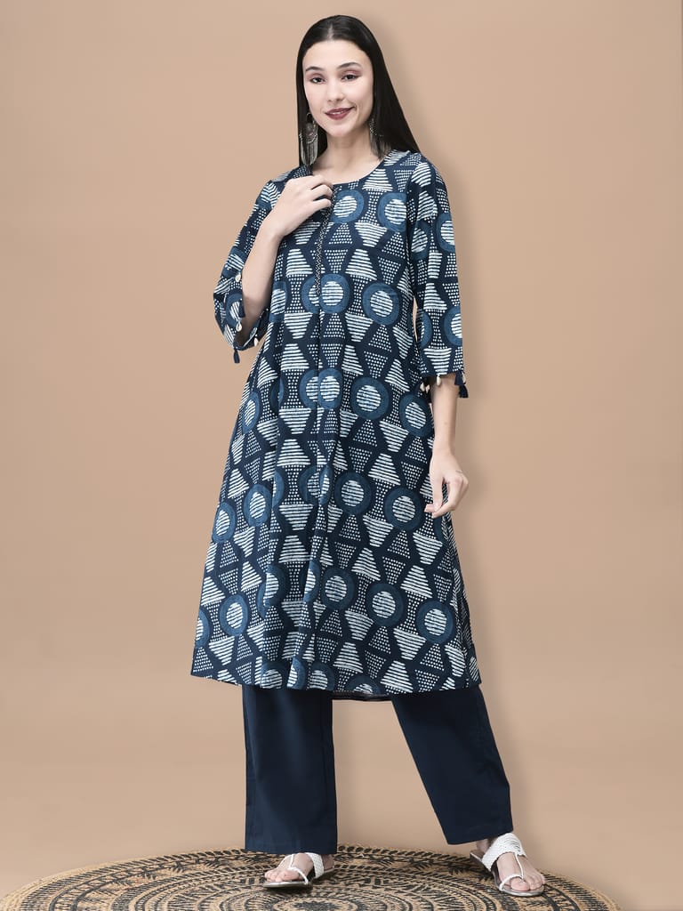 Women Cotton Indigo Geometric Print Kurta Comfort Pant Dupatta