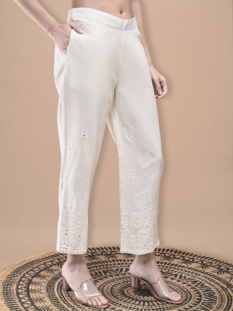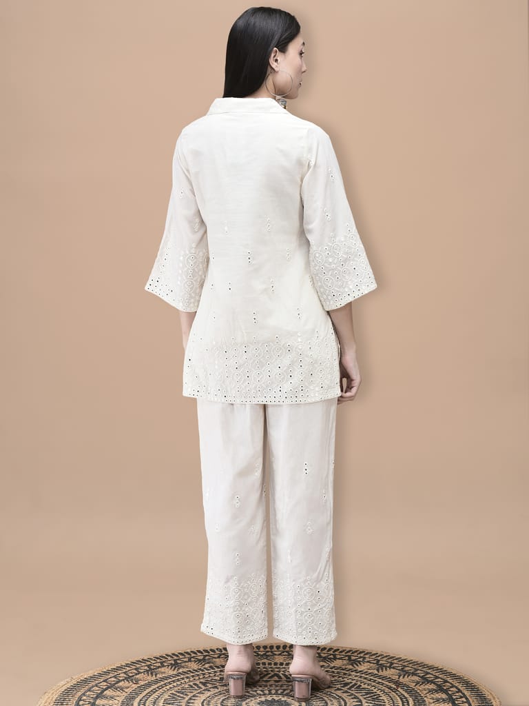 Women Cotton Off White Embroidered Co-Ord Set