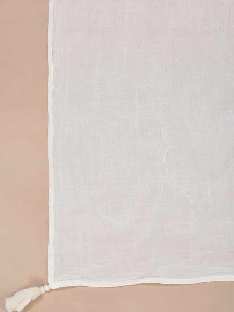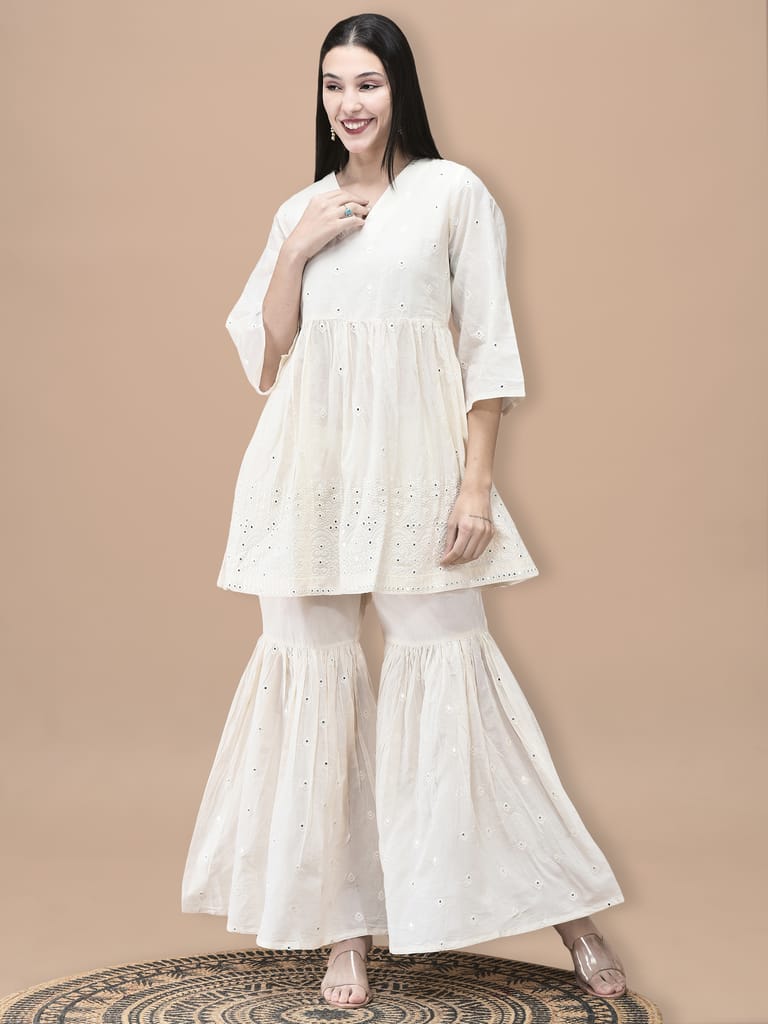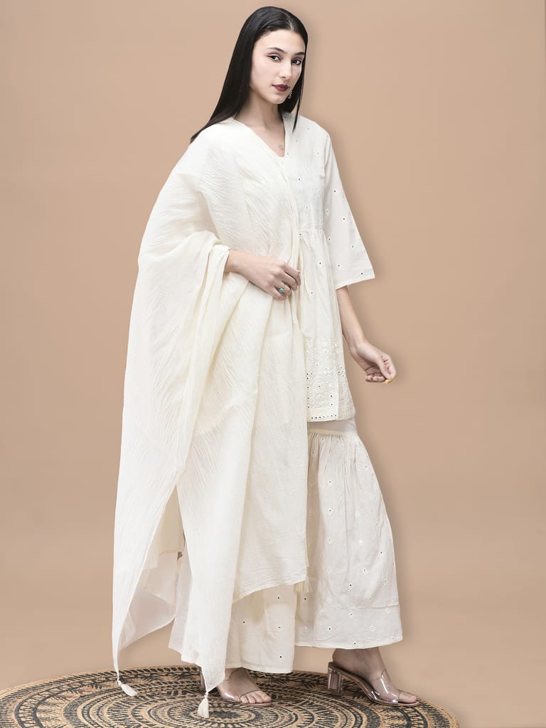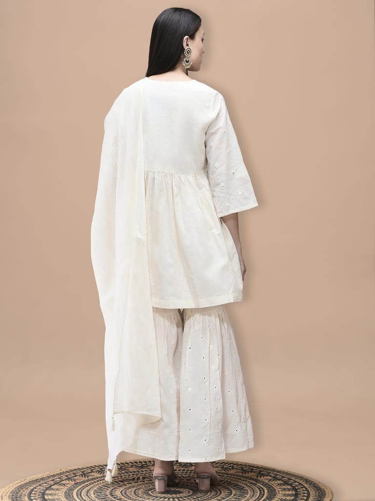 Women Cotton Off White Embroidered Kurta Sharara Dupatta