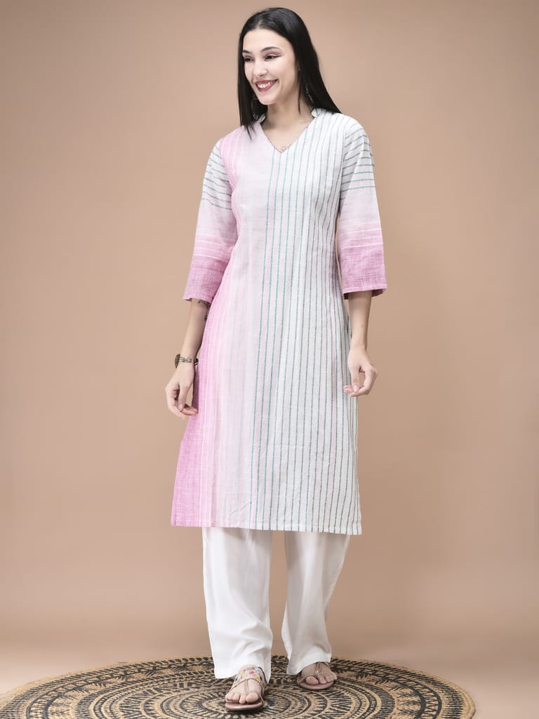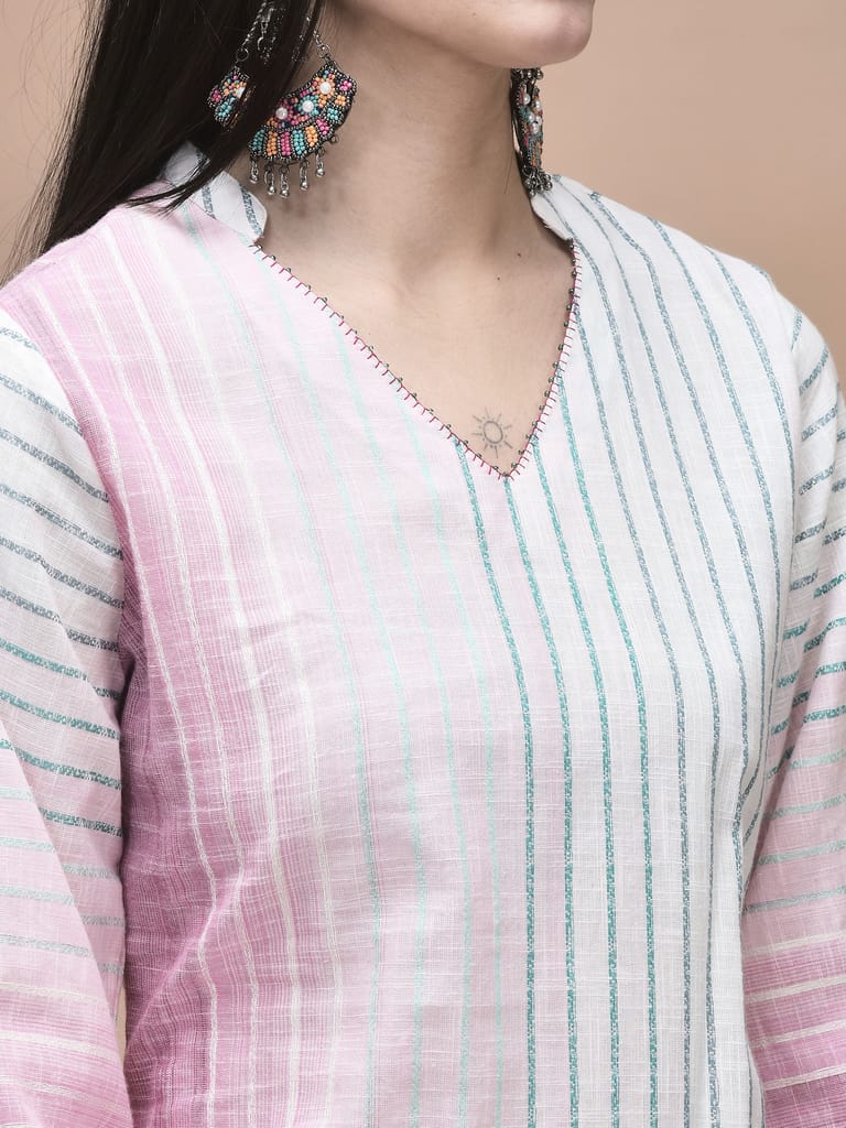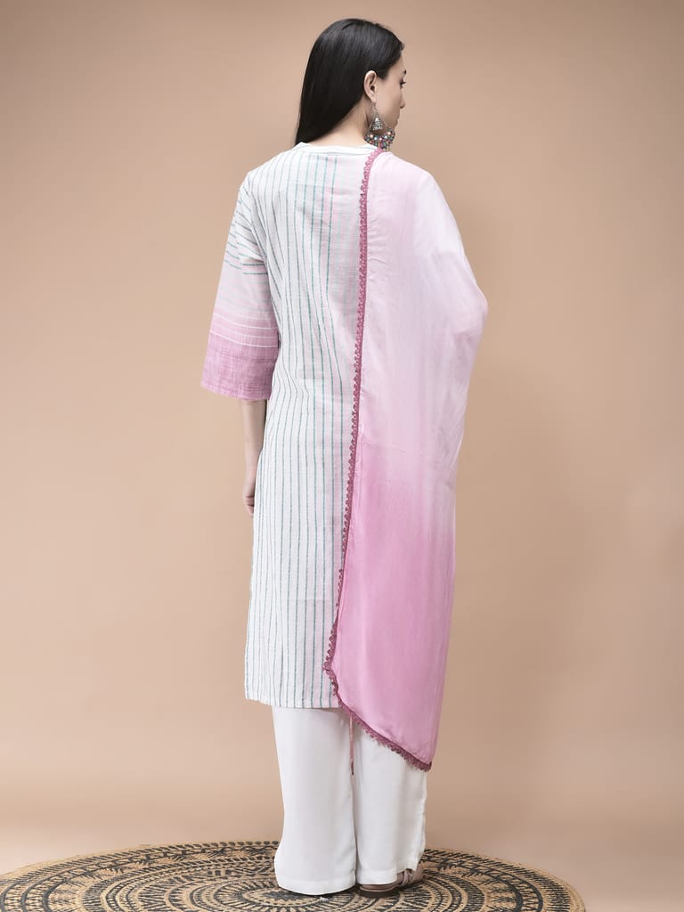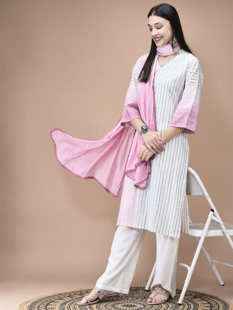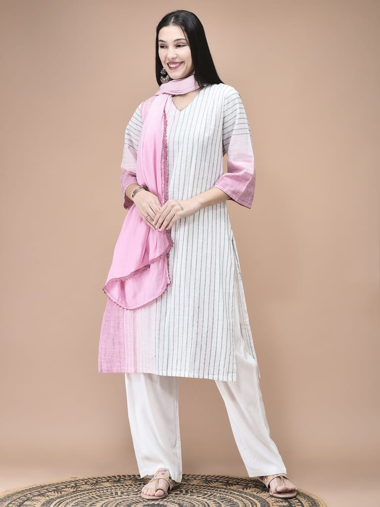 Women Cotton Off White Yarn Dyed Kurta Comfort Pant Dupatta
