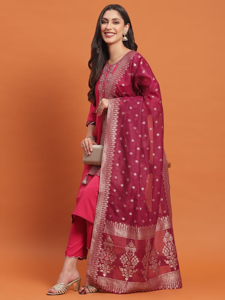 Women Fuchsia Embroidered Kurta Trouser Dupatta