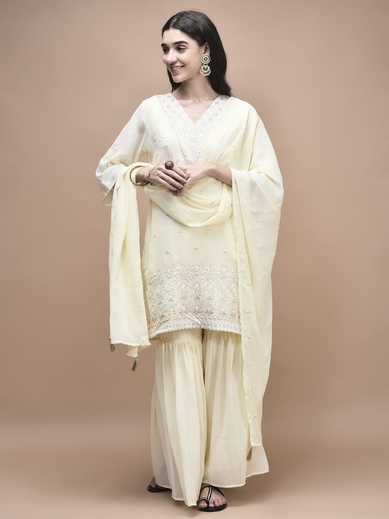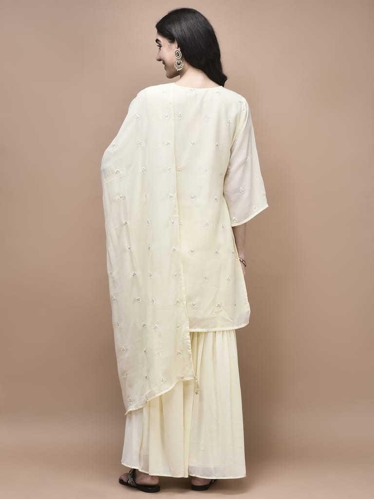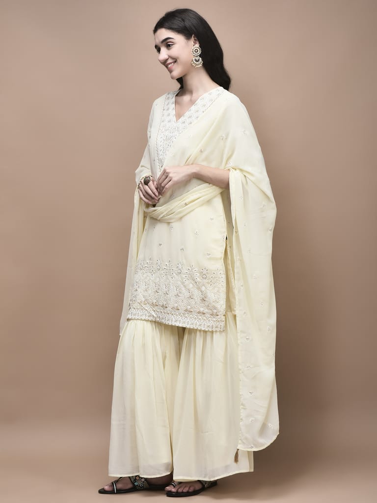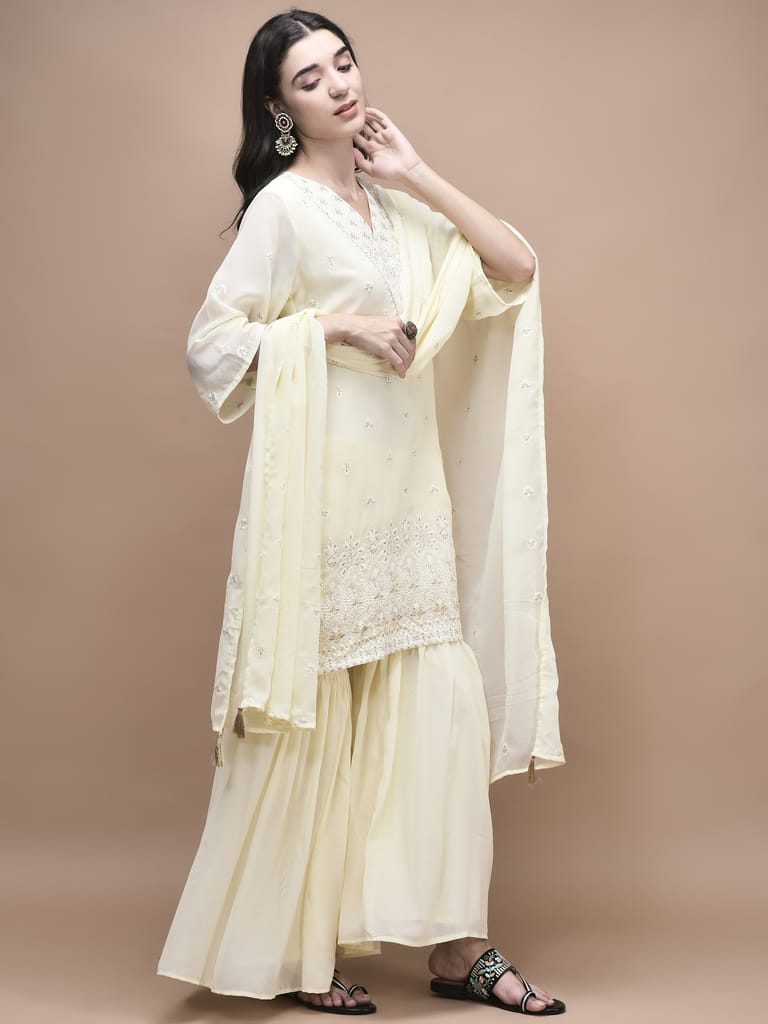 Women Georgette Off White Embroidered Kurta Sharara Dupatta