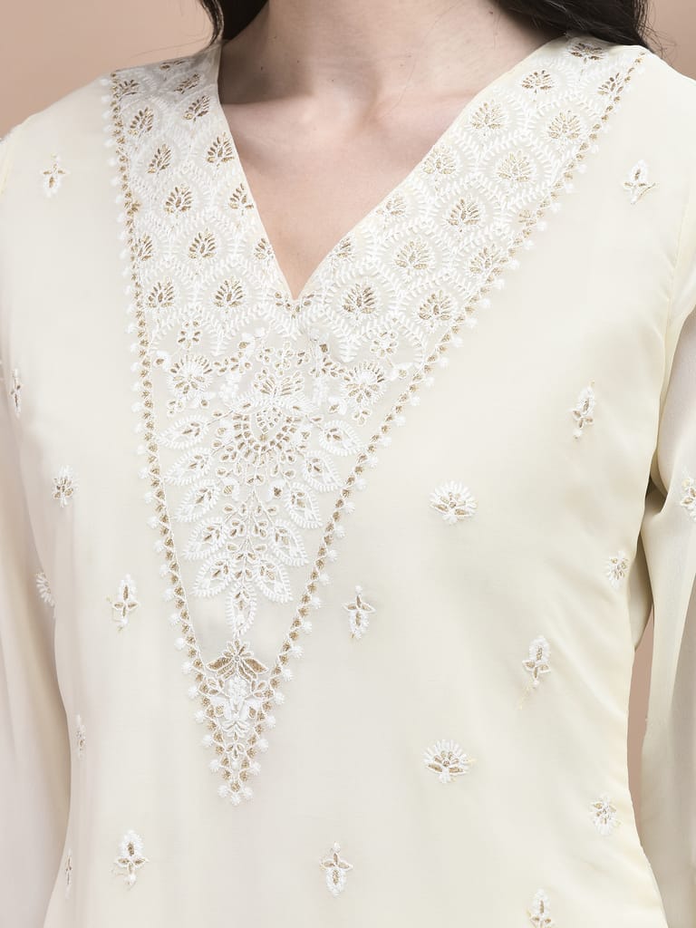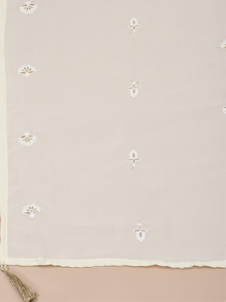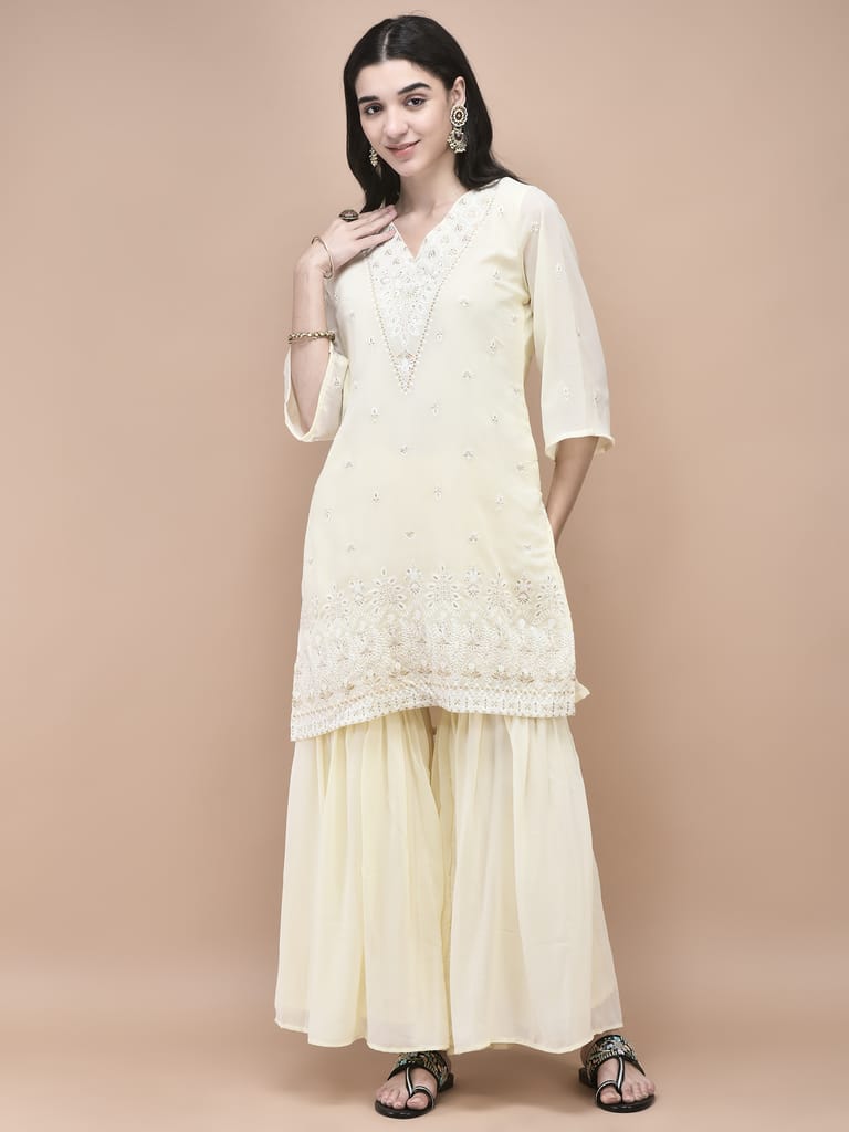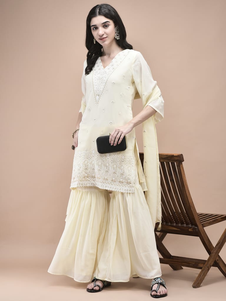 Women Georgette Off White Embroidered Kurta Sharara Dupatta
