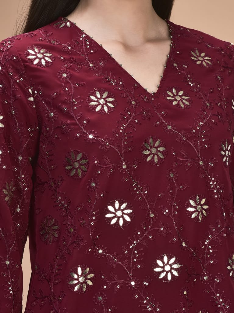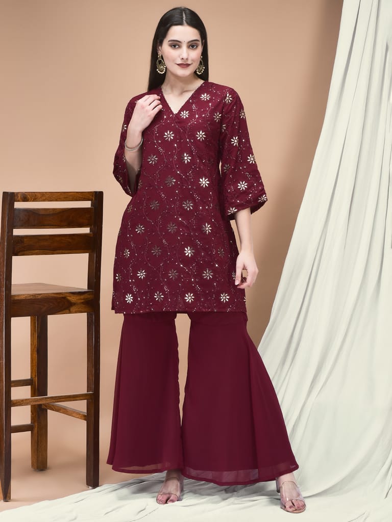Women Georgette Purple Embroidered Kurta Sharara Dupatta