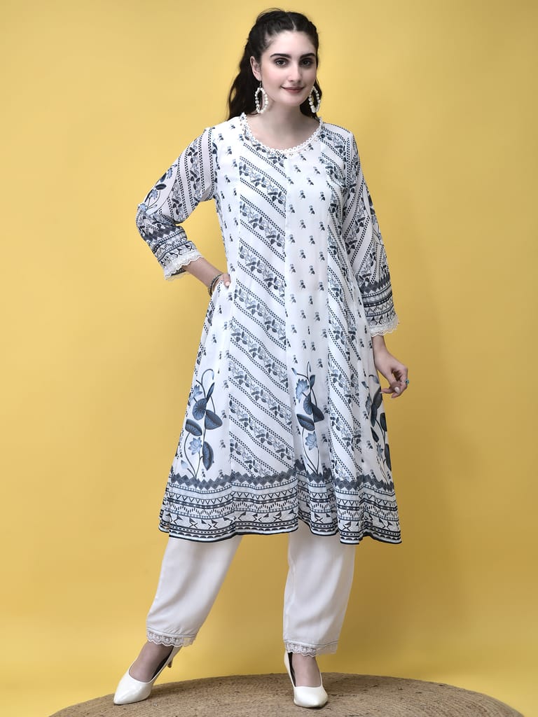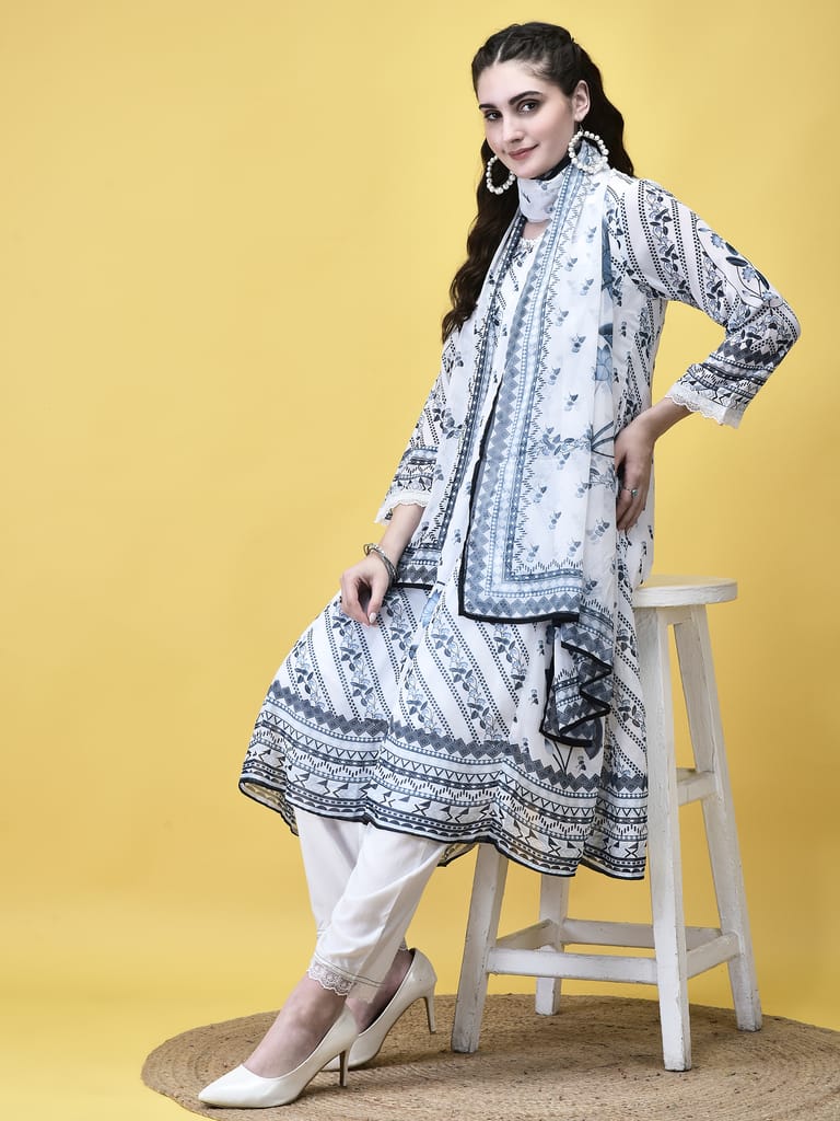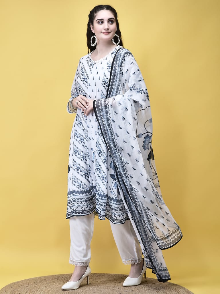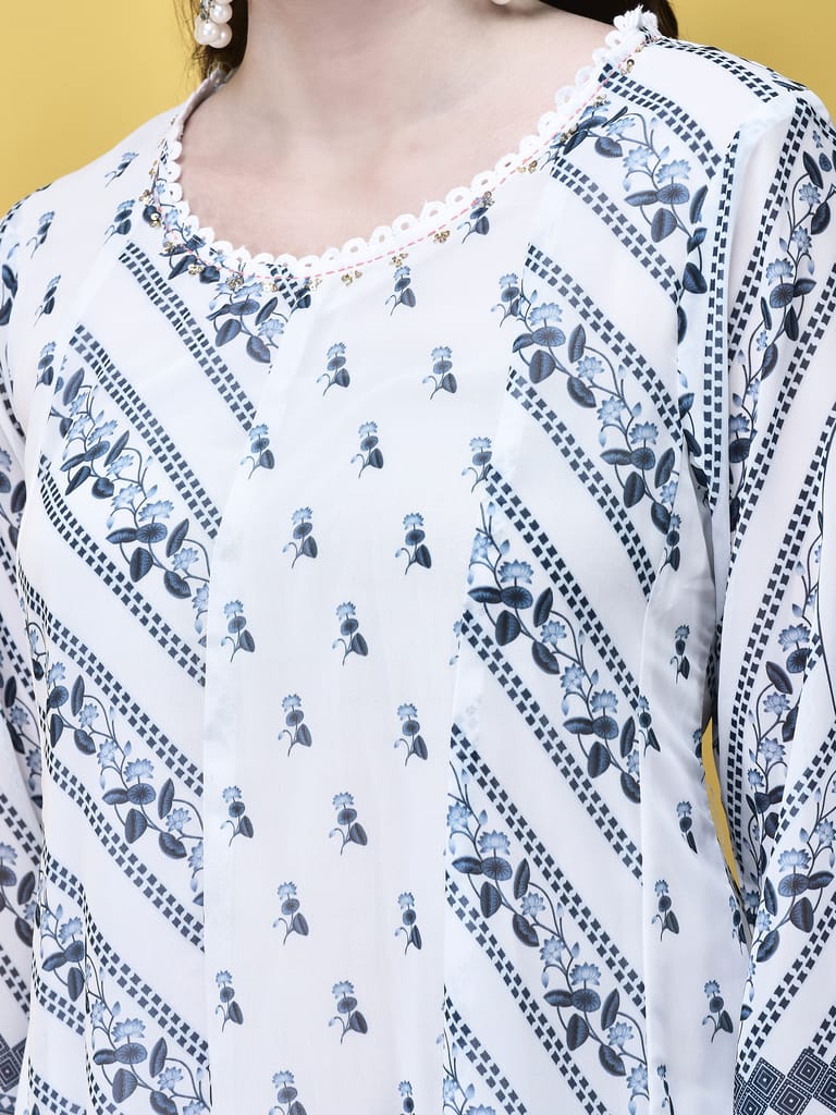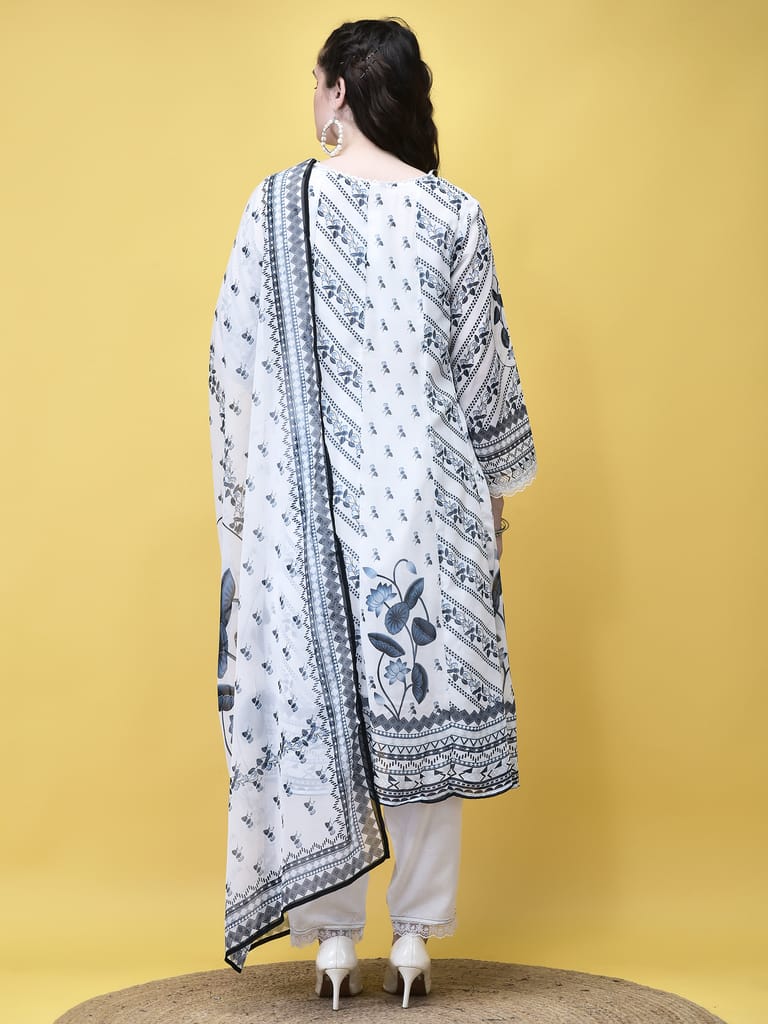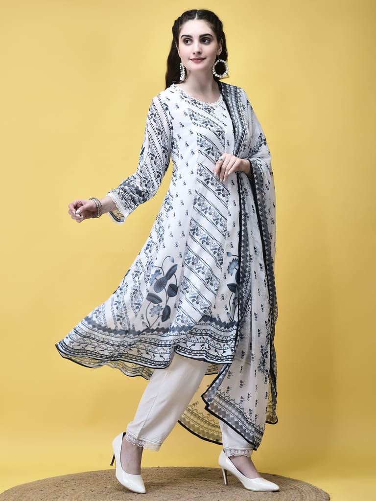 Women Georgette White Floral Print Kurta Trouser Dupatta