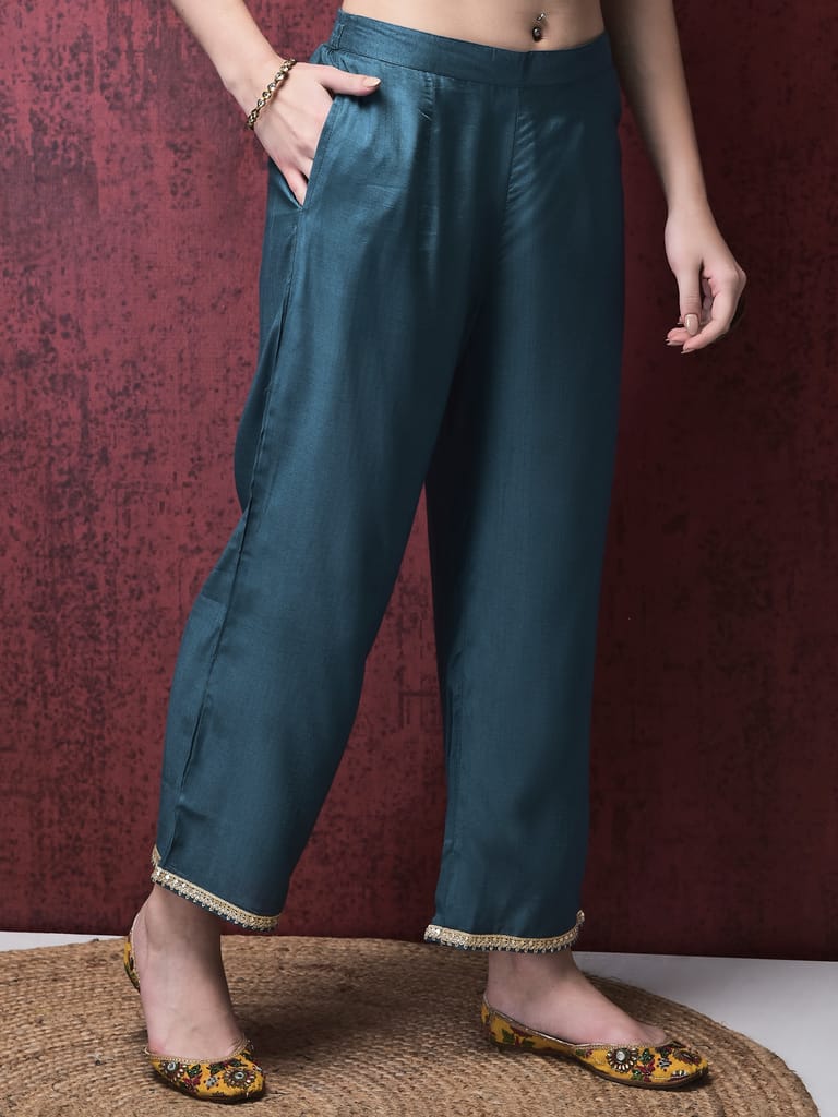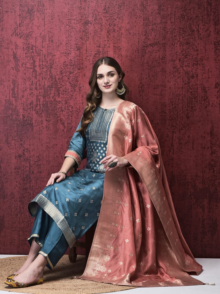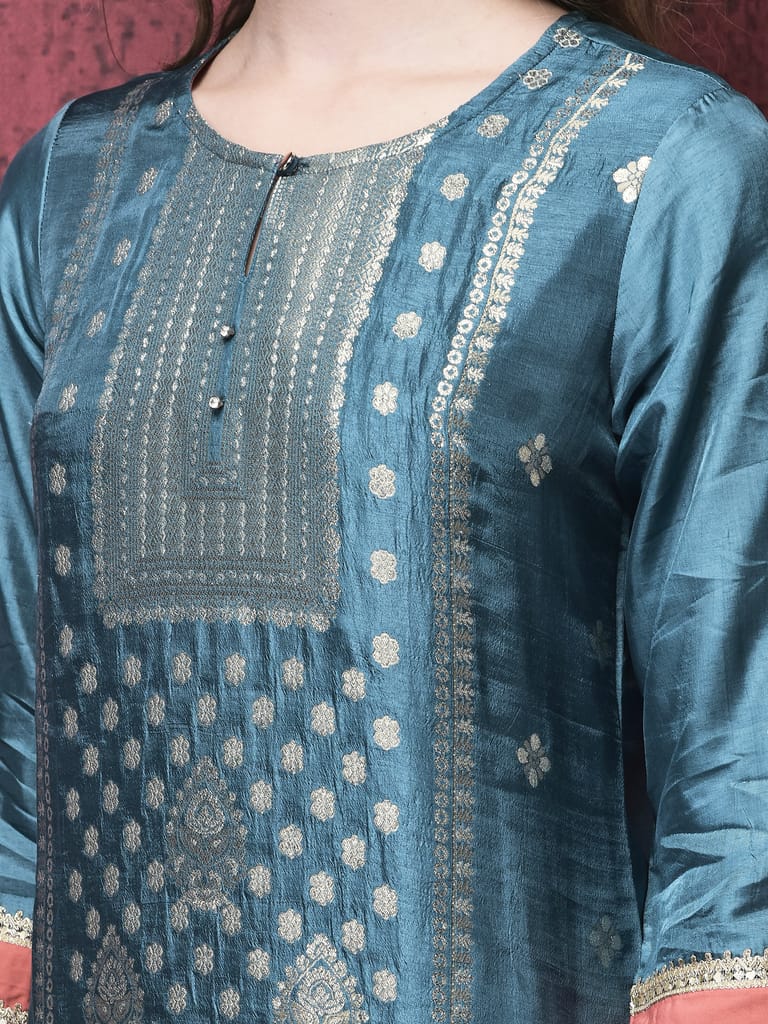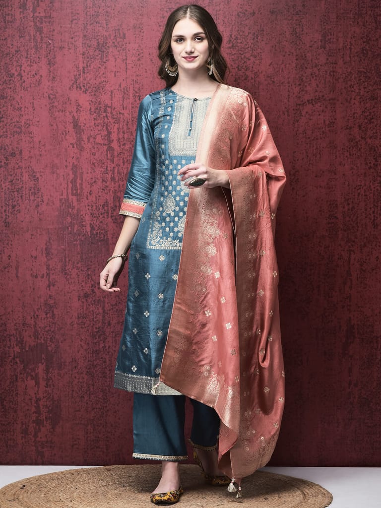 Women Jacquard Blue Woven Kurta Comfort Pant Dupatta