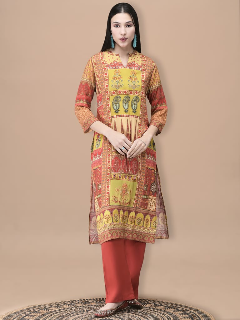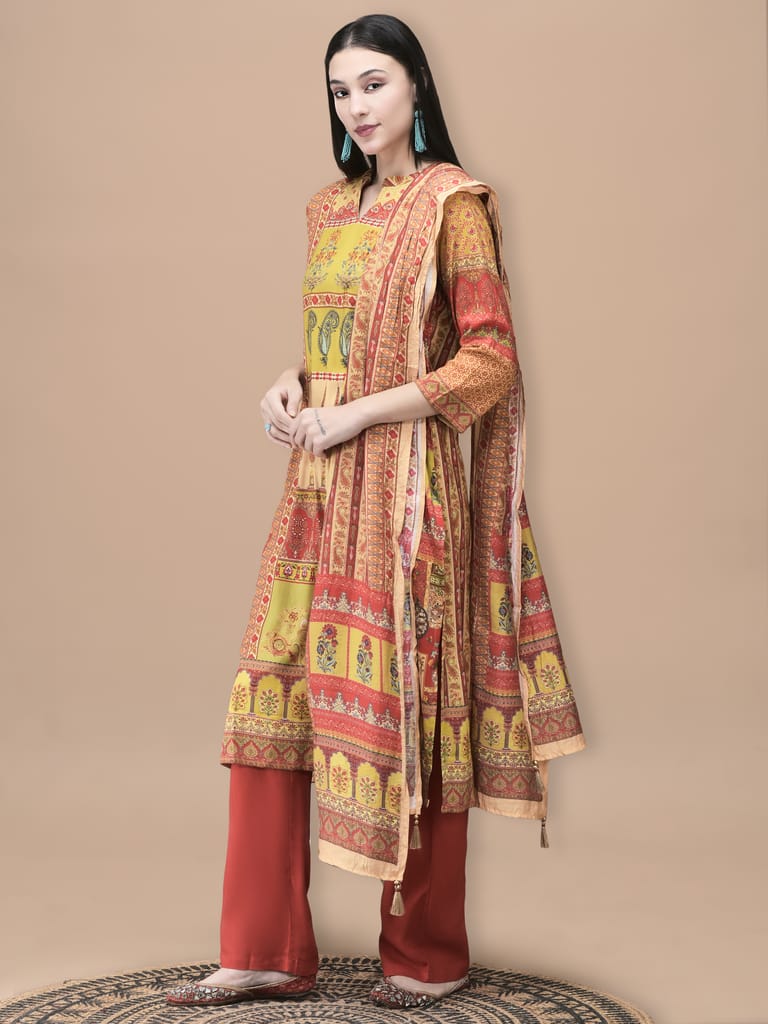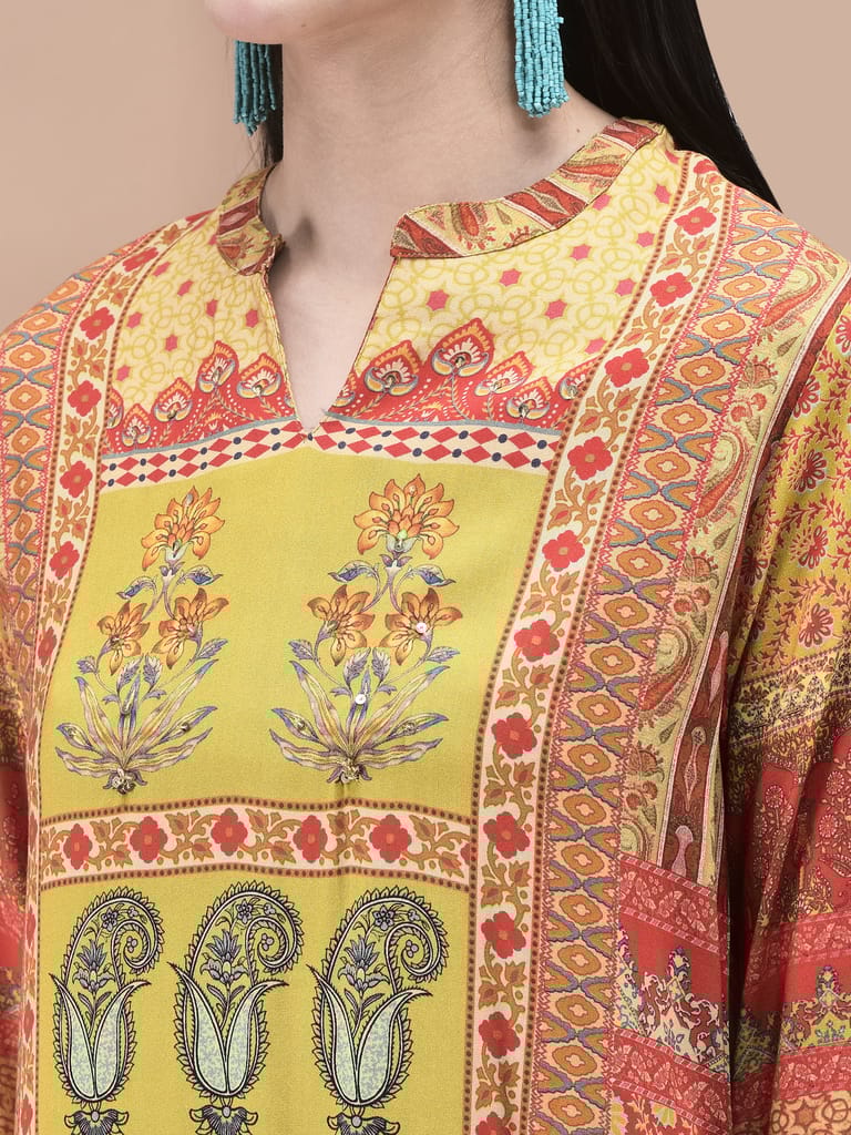 Women Liva Mustard Mughal Print Kurta Comfort Pant Dupatta