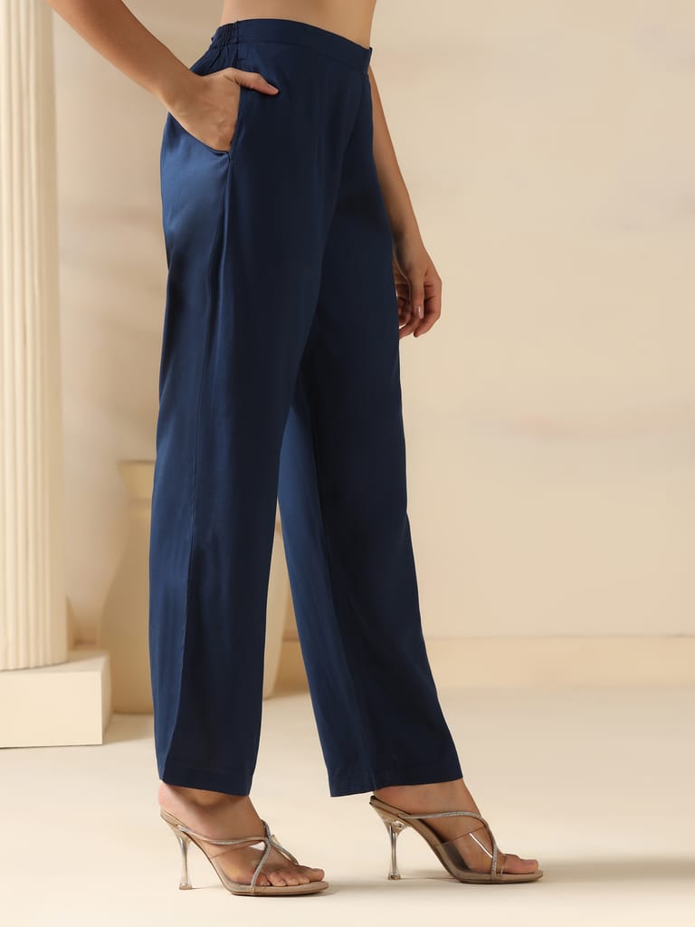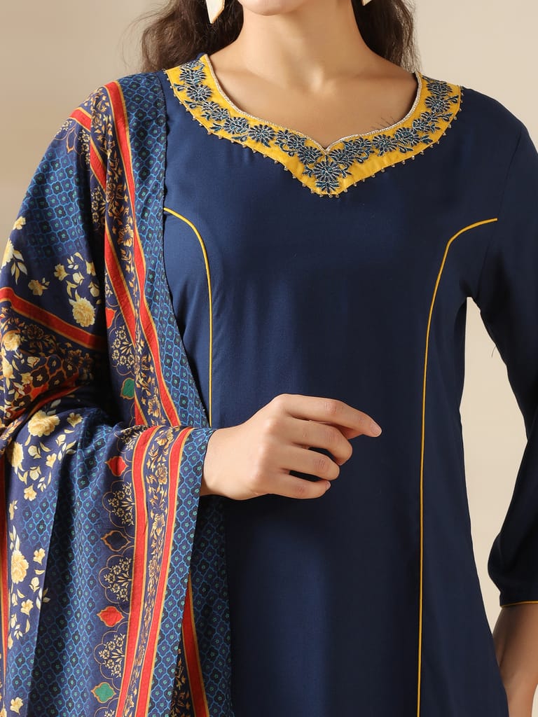 Women Liva Navy Blue Solid Kurta Comfort Pant Dupatta