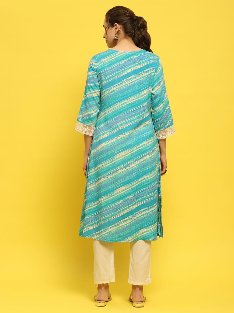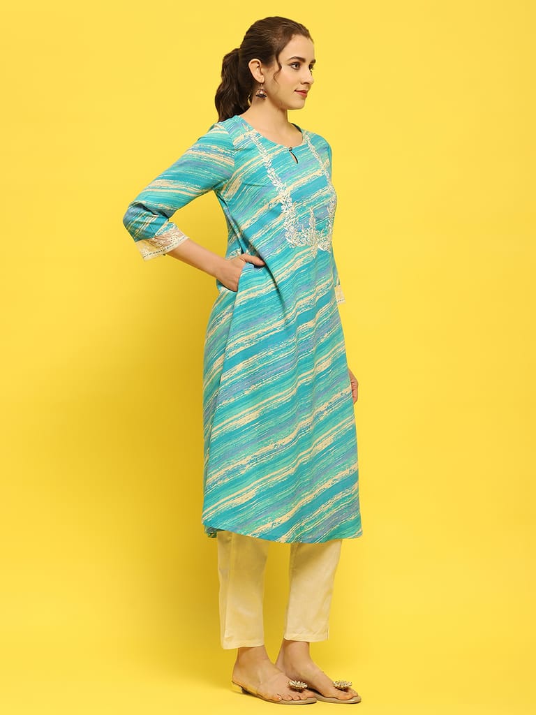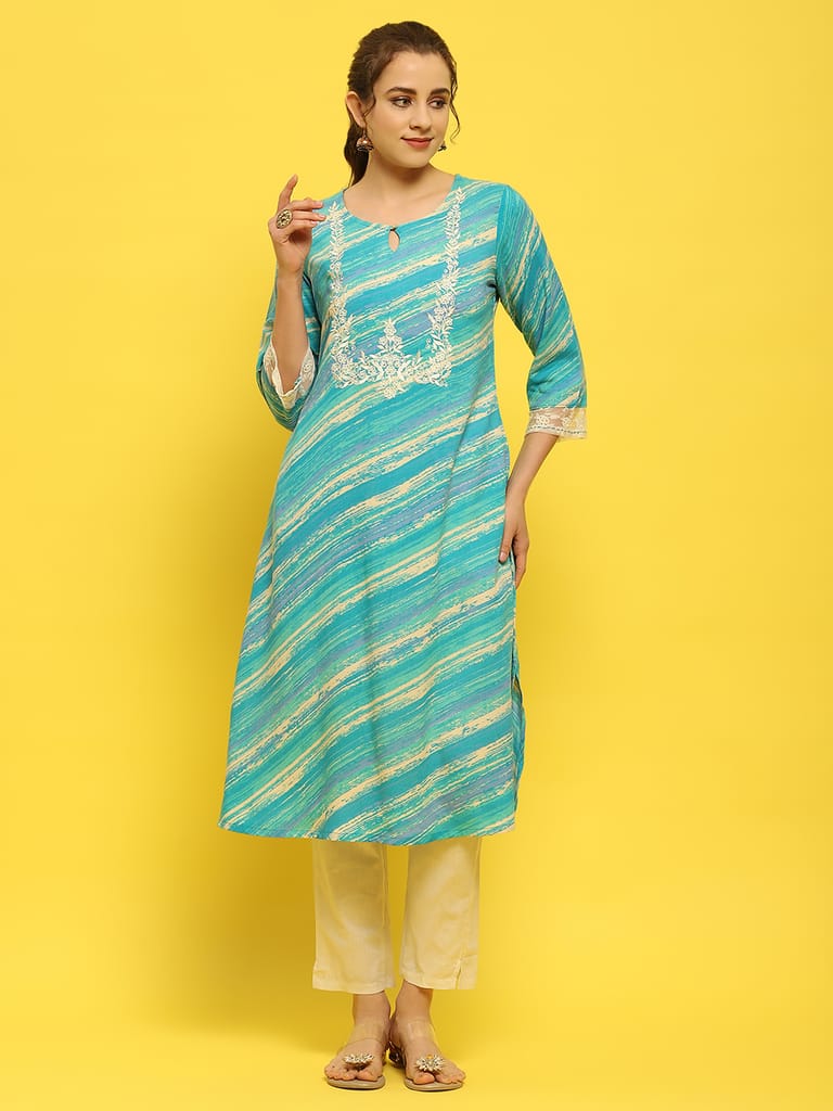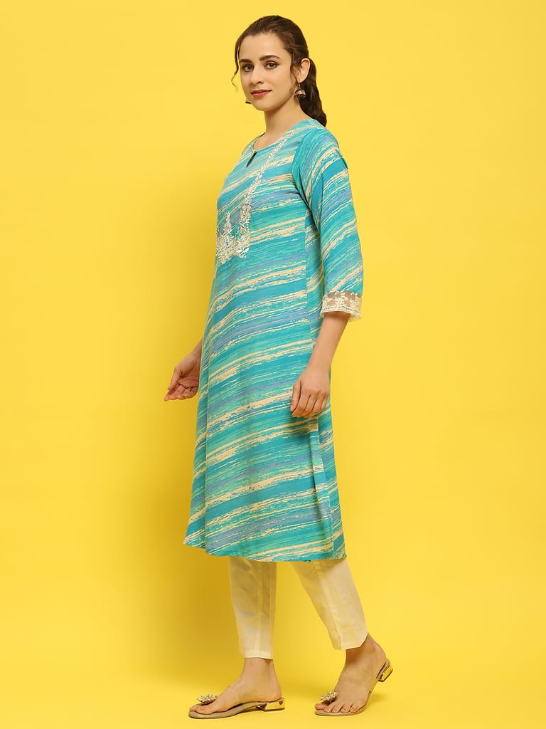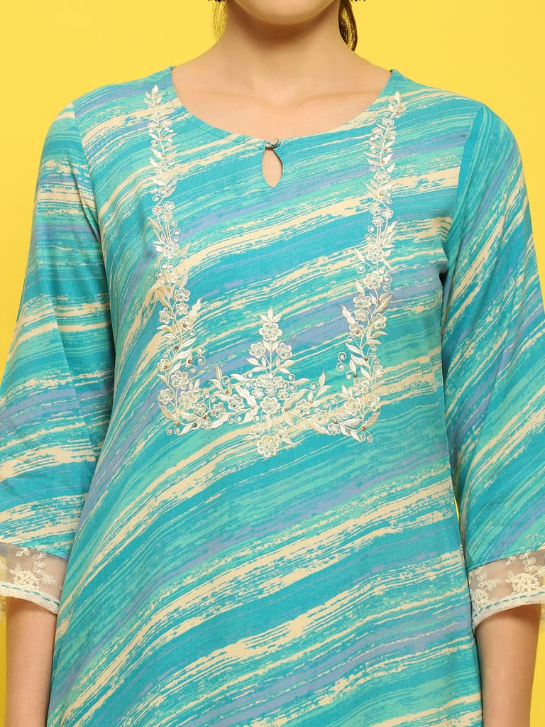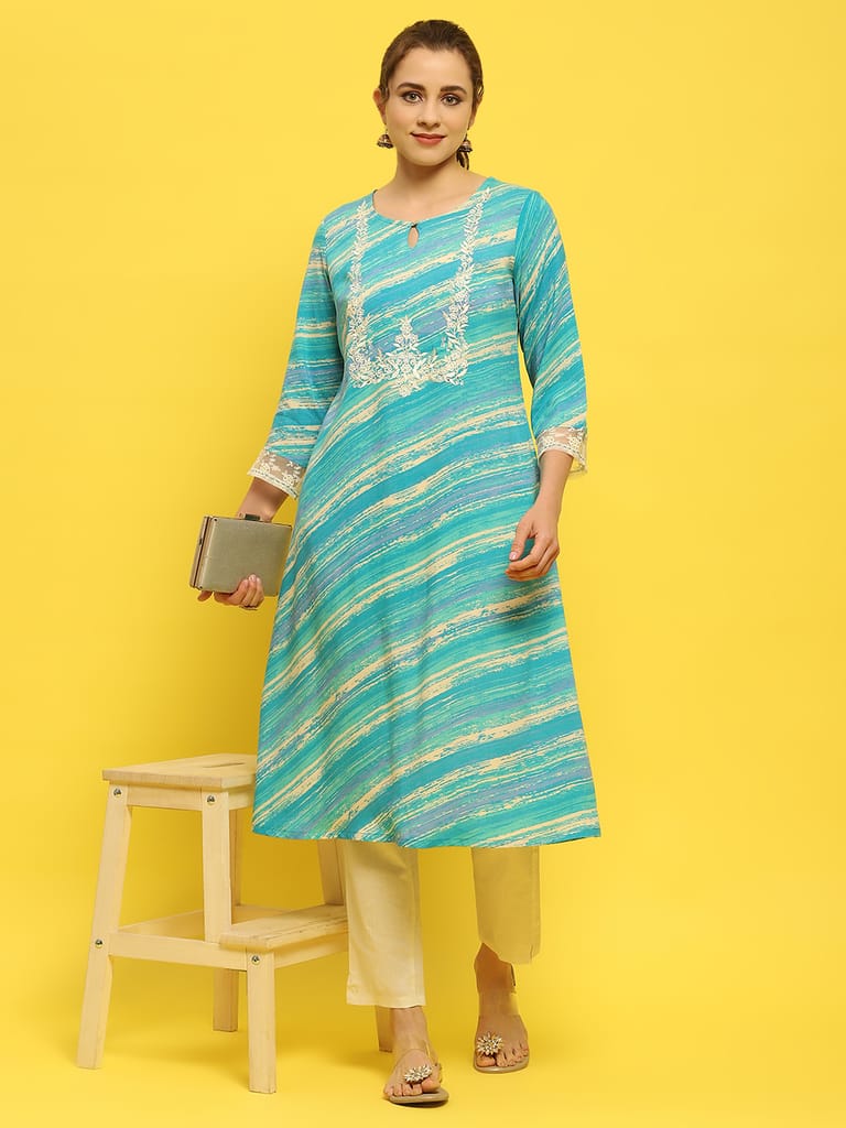 Women Liva Rayon Blue Embroidered Kurta
