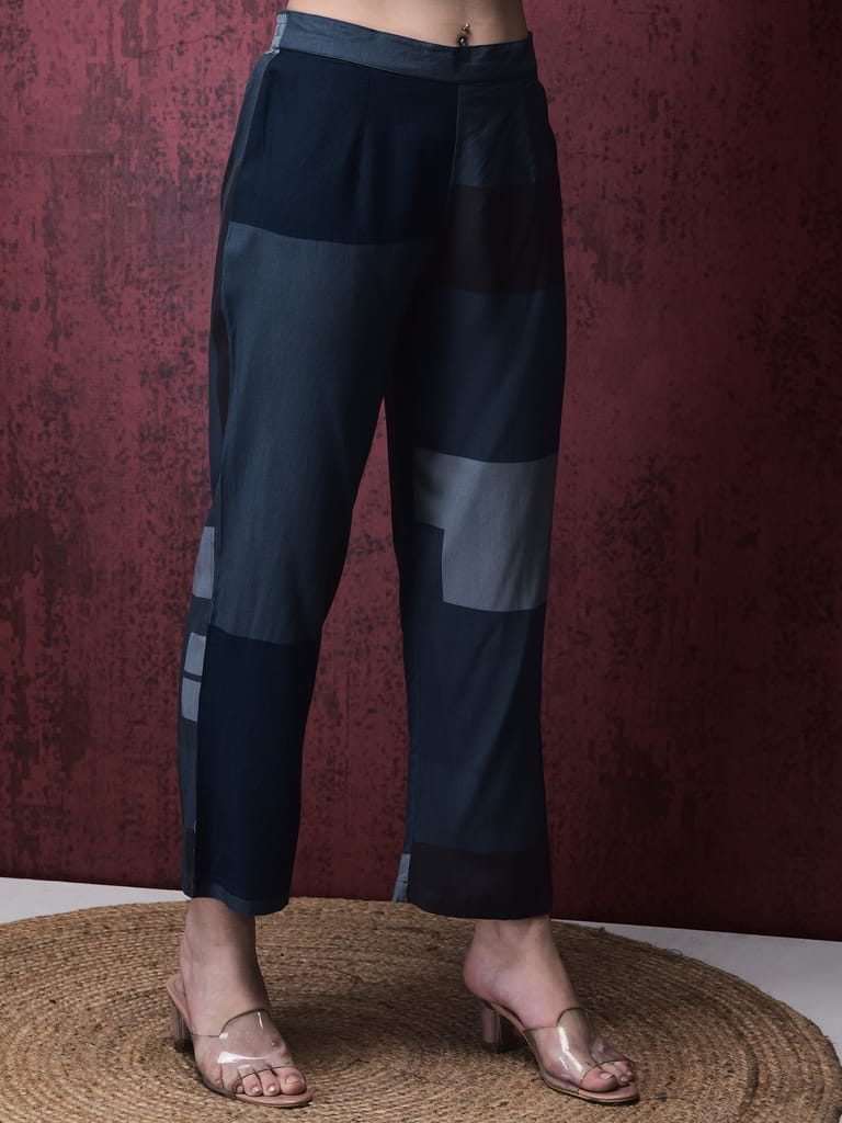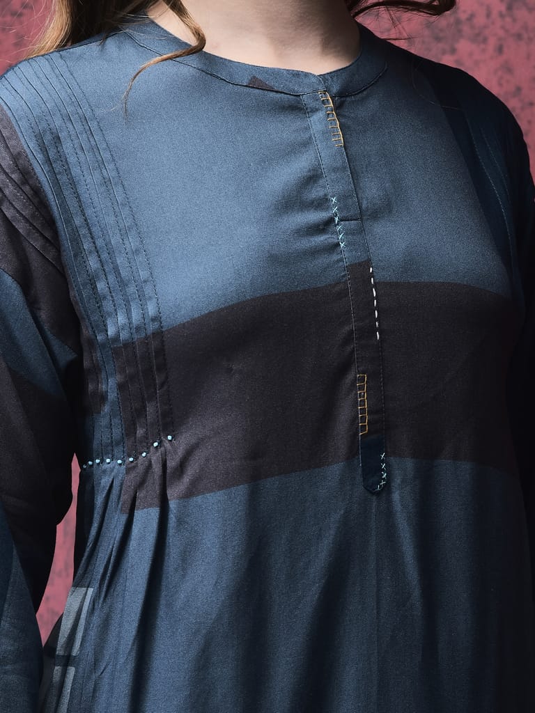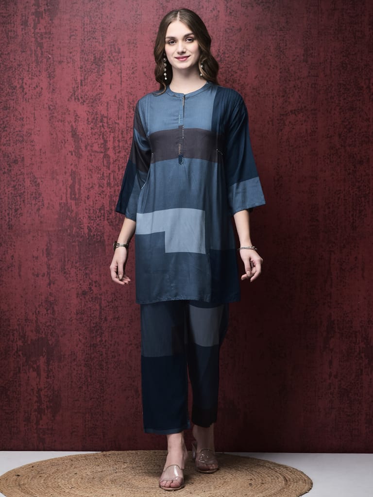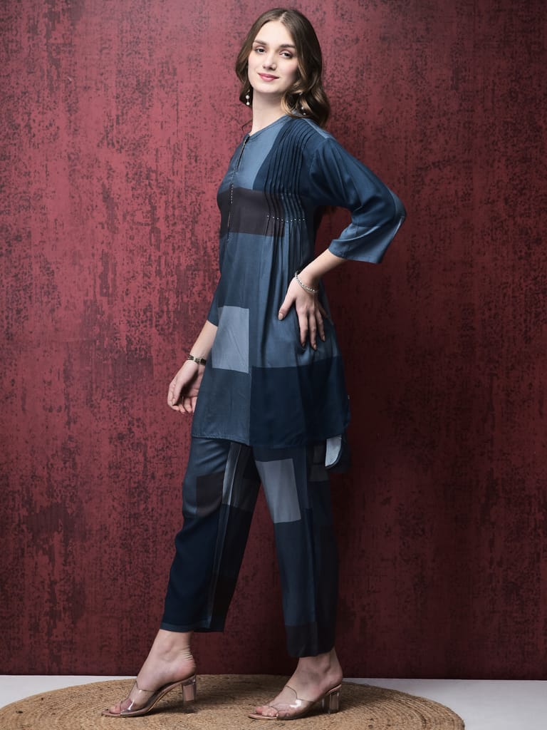 Women Liva (Rayon) Blue Geometric Print Kurta With Comfort Pant