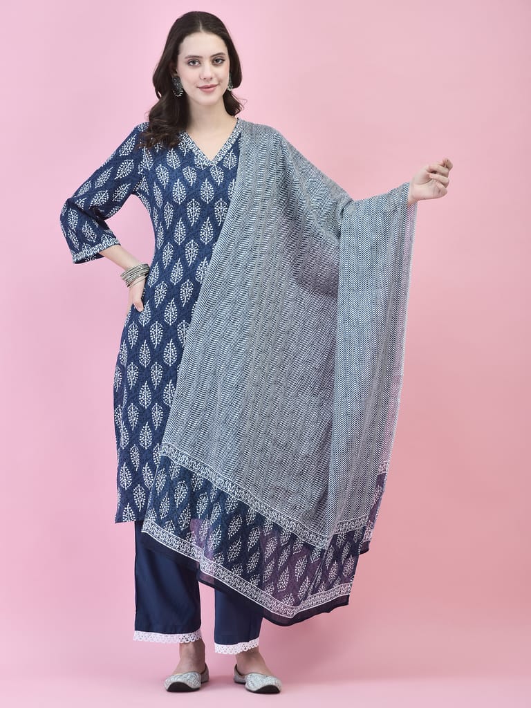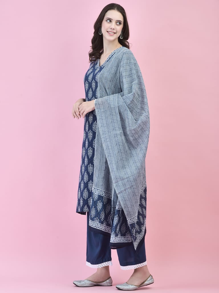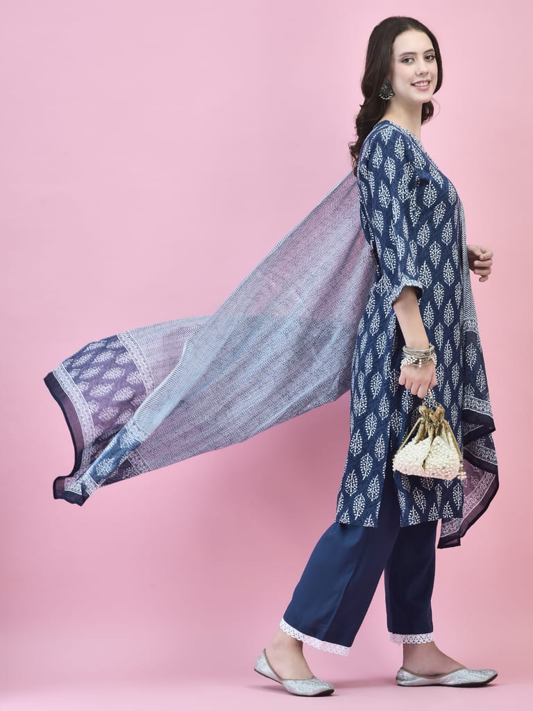 Women Liva Rayon Indigo Floral Print Kurta Comfort Pant Dupatta