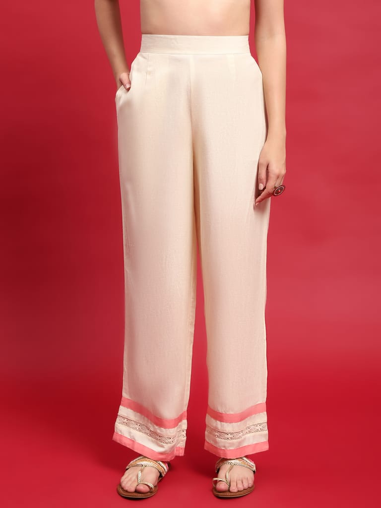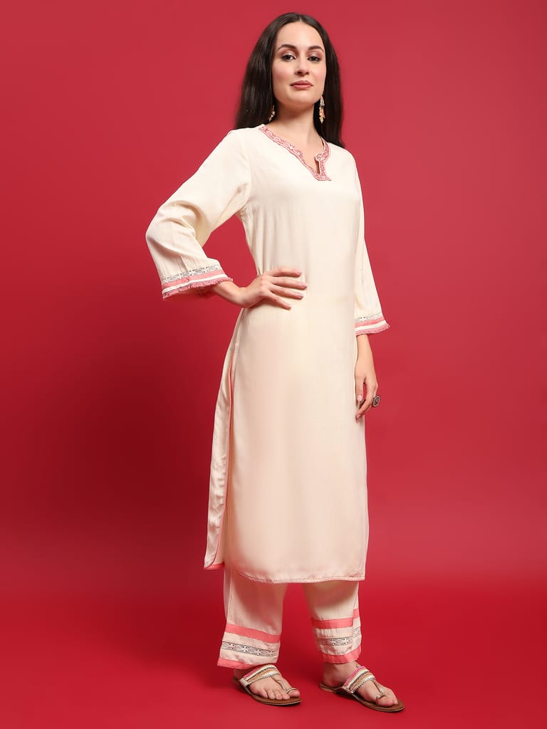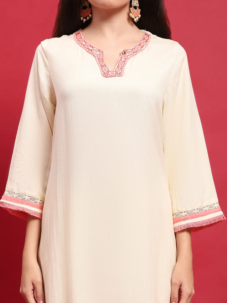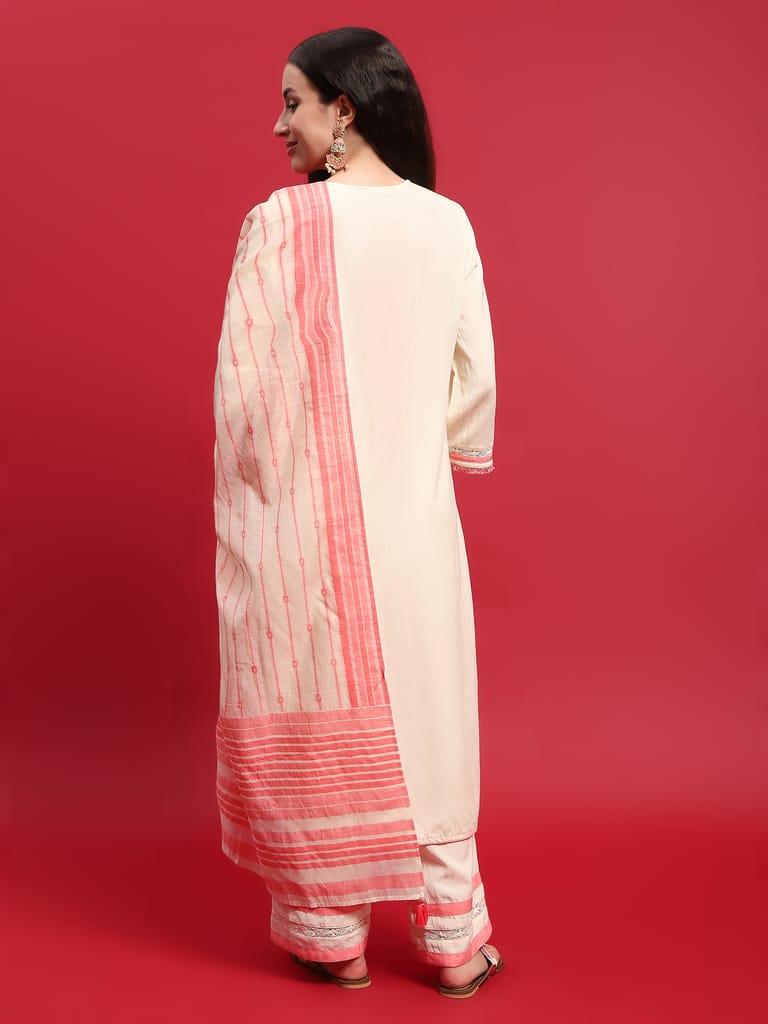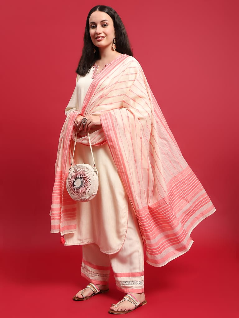 Women Liva (Rayon) Off White Embroidered Kurta Comfort Pant Dupatta