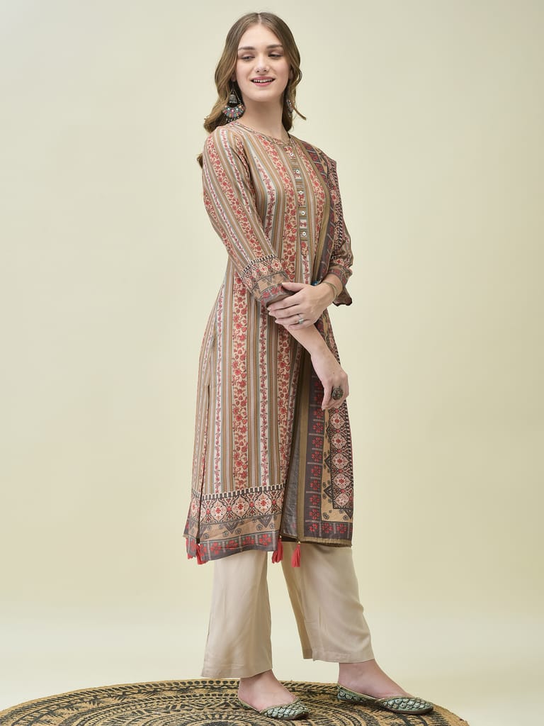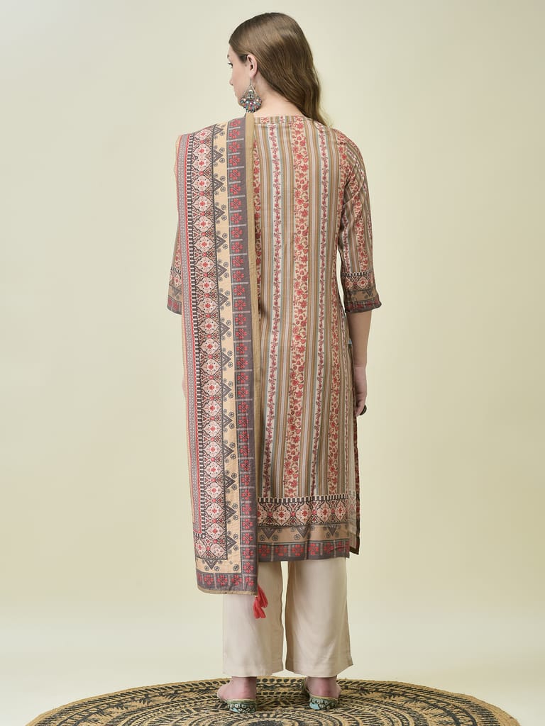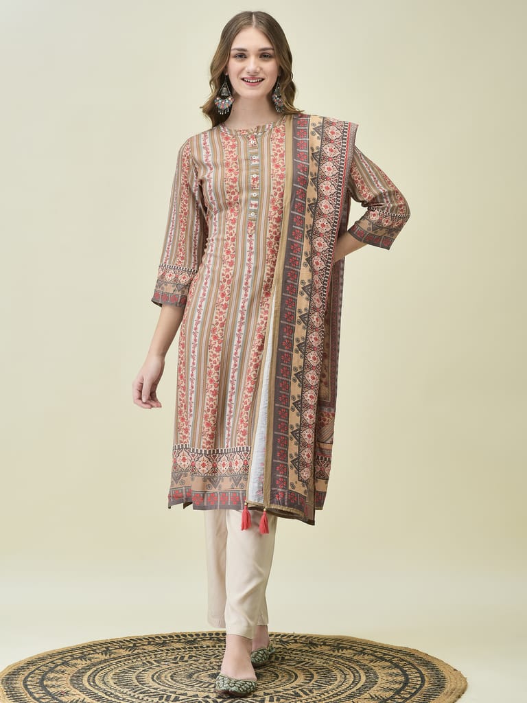 Women Liva (Rayon) Off White Floral Print Kurta Comfort Pant Dupatta
