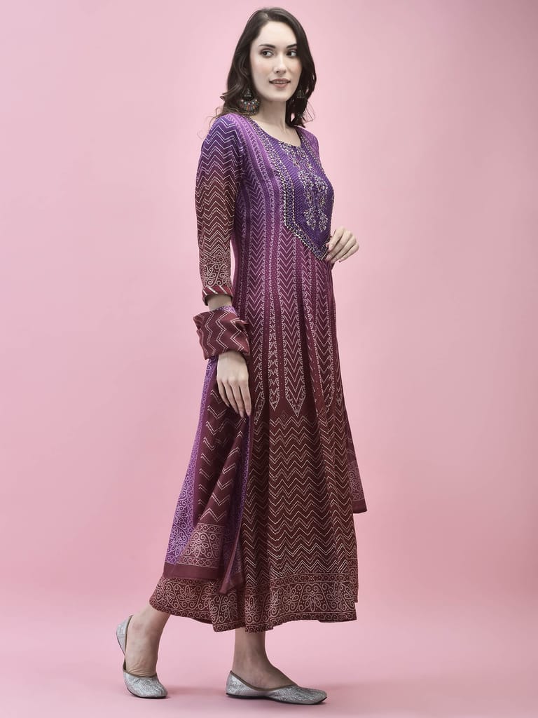 Women Liva Rayon Purple Embroidered Dress With Dupatta