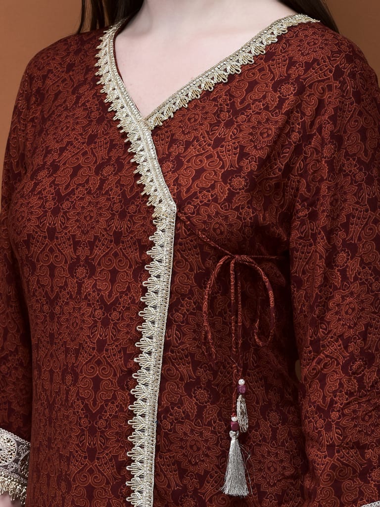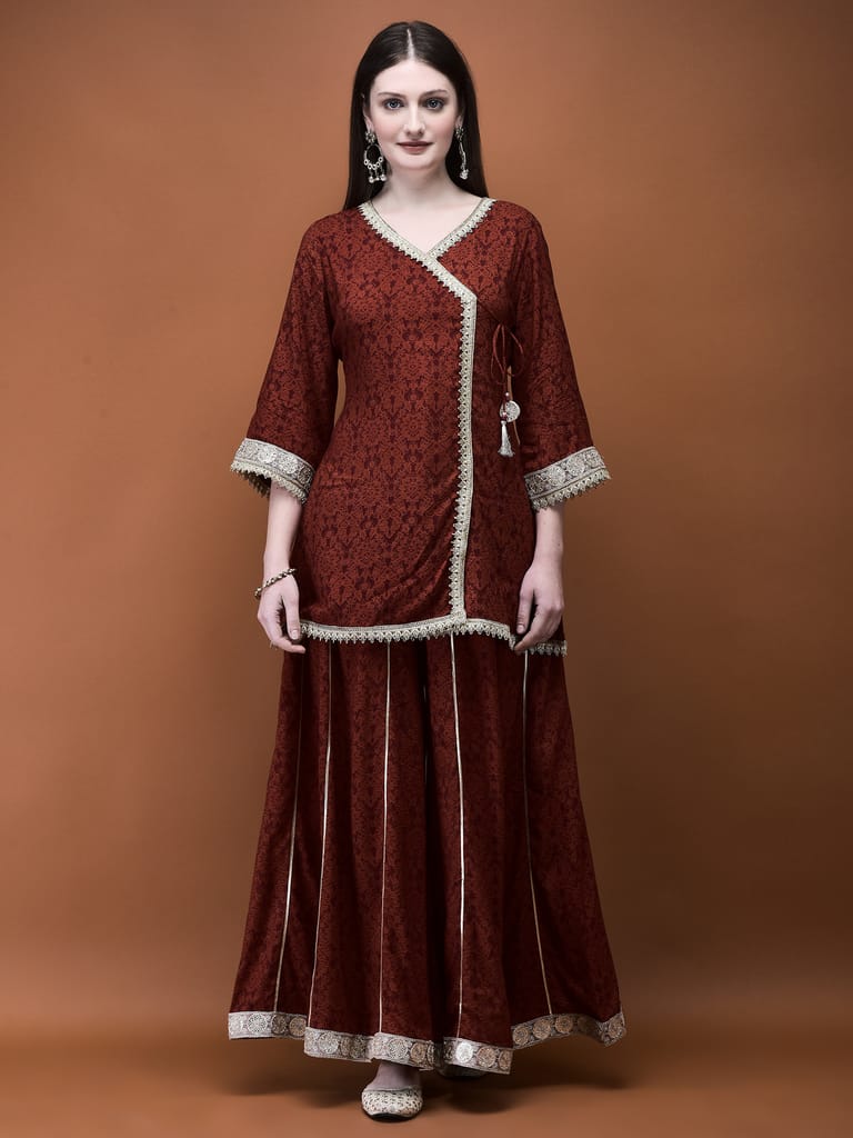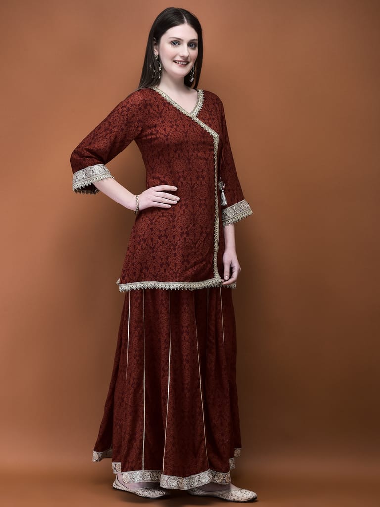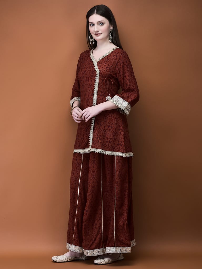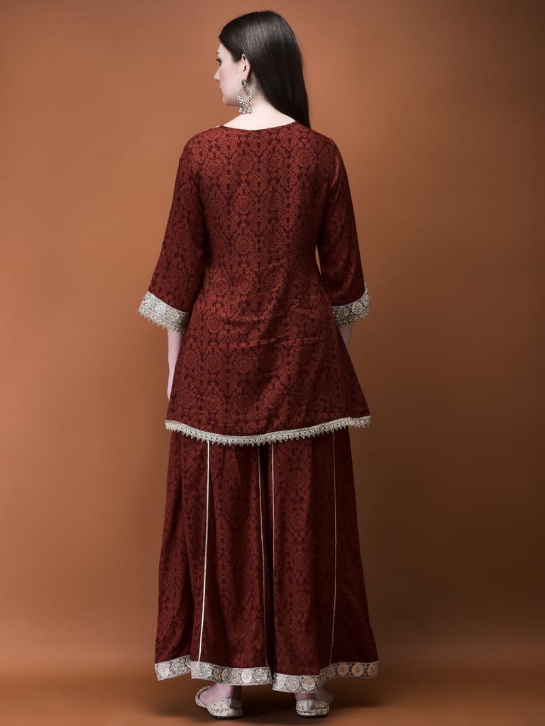 Women Liva (Rayon) Rust Floral Print Kurta With Split Pant
