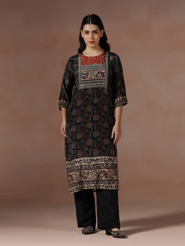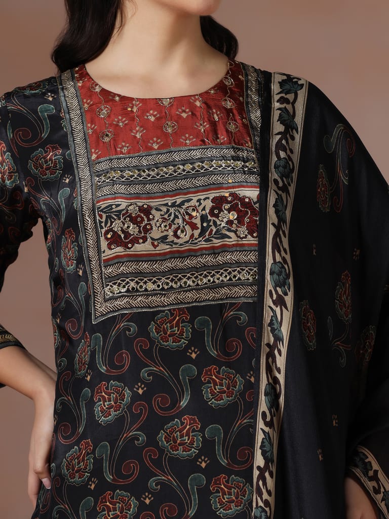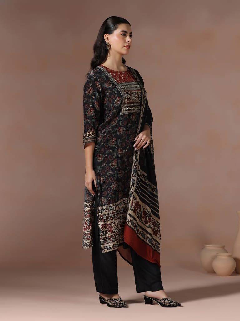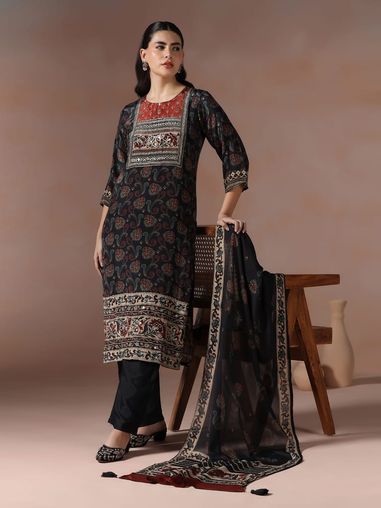 Women Muslin Black Ajrakh Print Kurta Comfort Pant Dupatta