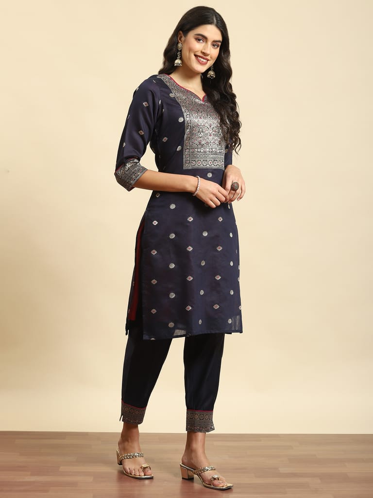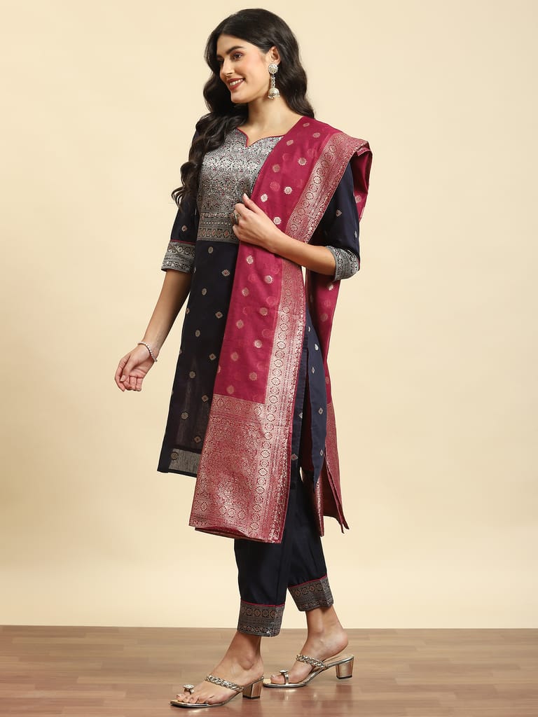 Women Navy Blue Woven Kurta Trouser Dupatta
