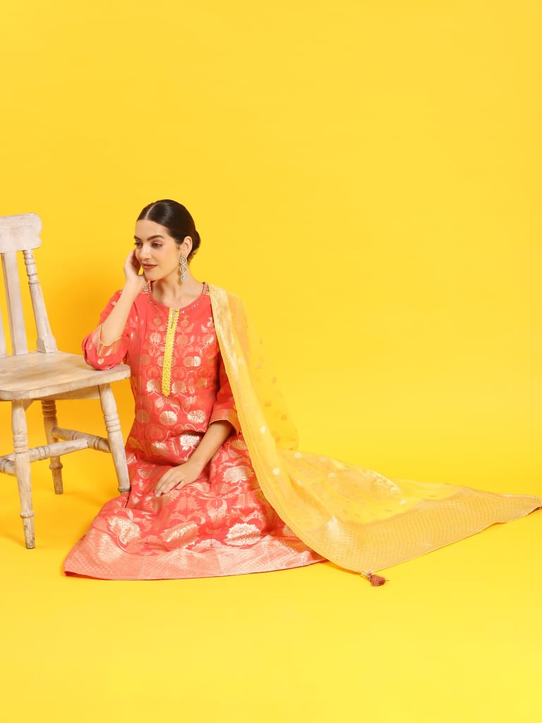 Women Pink Woven Dress With Dupatta
