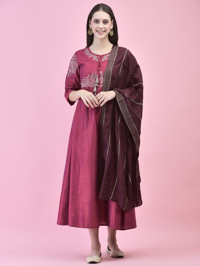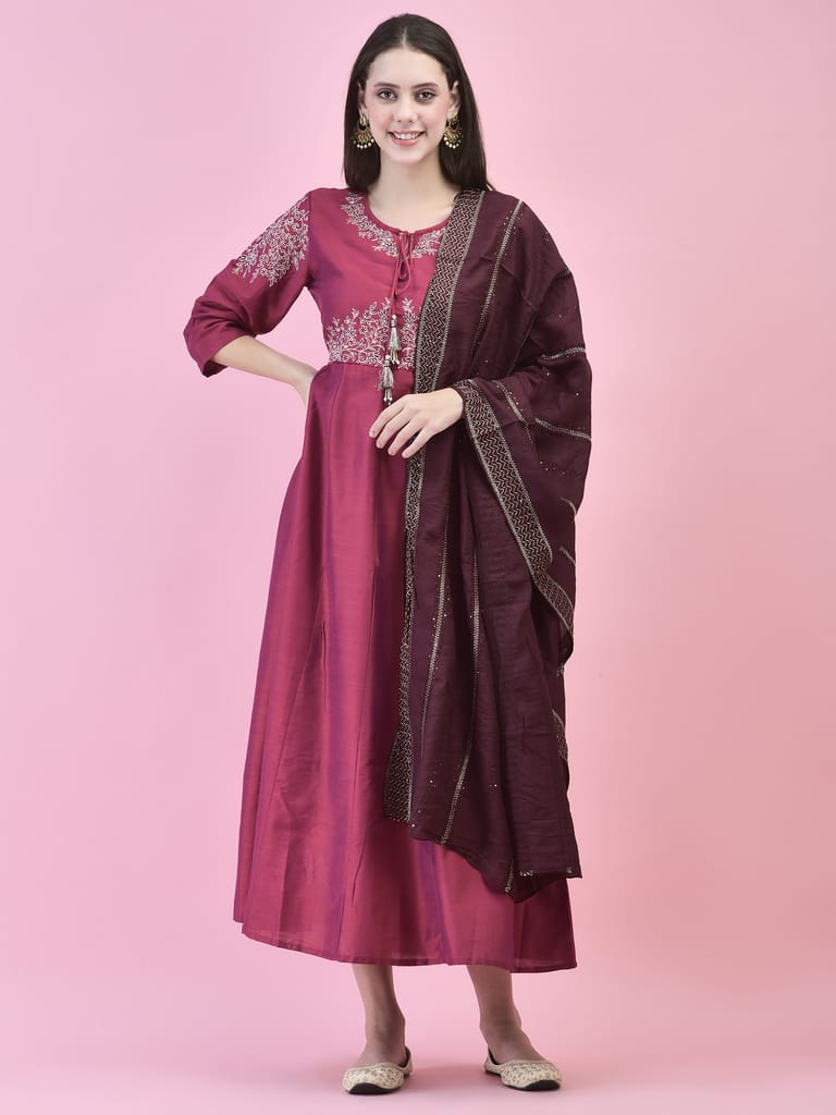 Women Poly Silk Burgundy Embroidered Dress With Dupatta