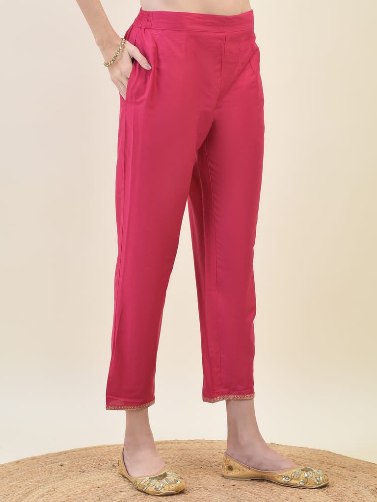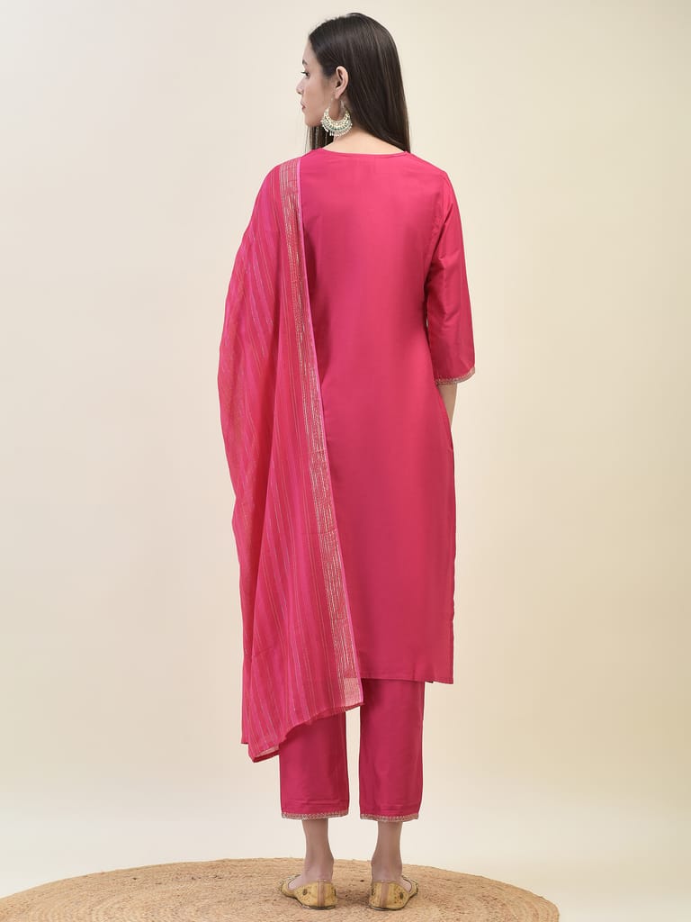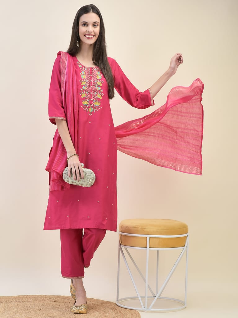 Women Poly Silk Fuchsia Embroidered Kurta Trouser Dupatta