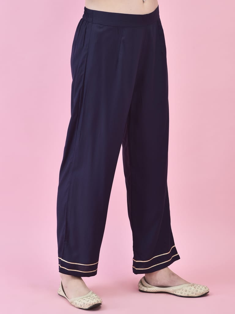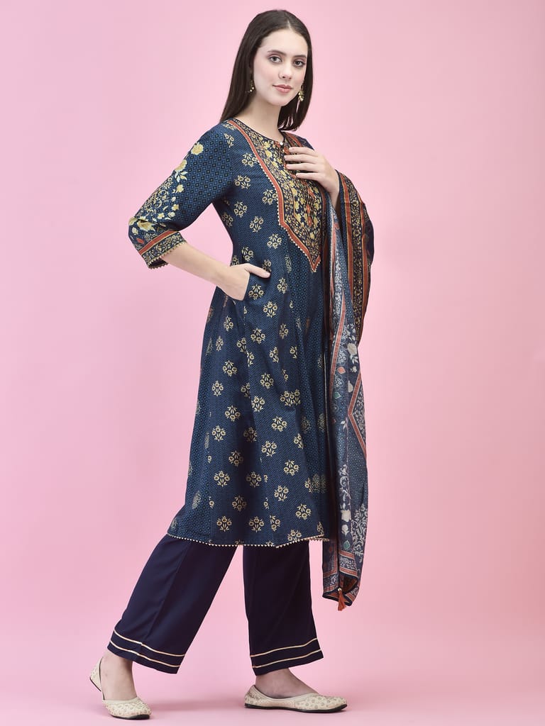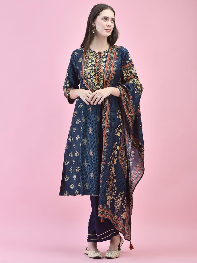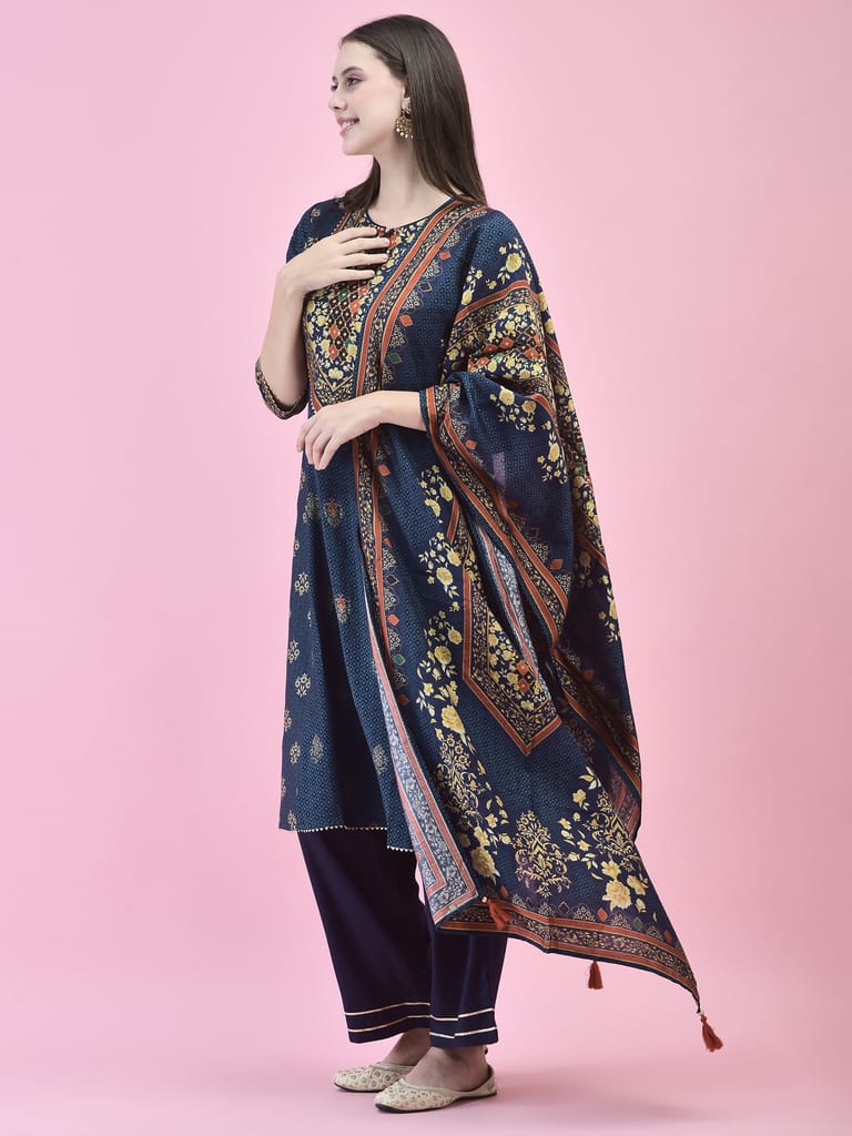 Women Poly Viscose Blue Floral Print Kurta Trouser Dupatta