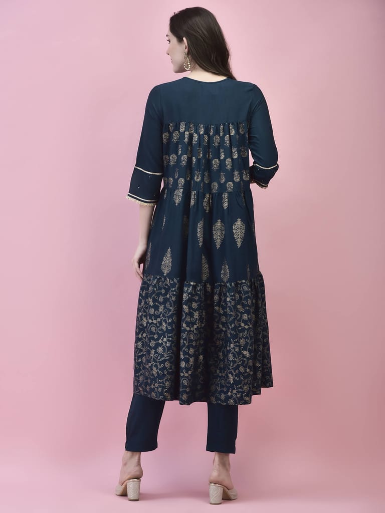 Women Poly Viscose Blue Printed Kurta With Trouser