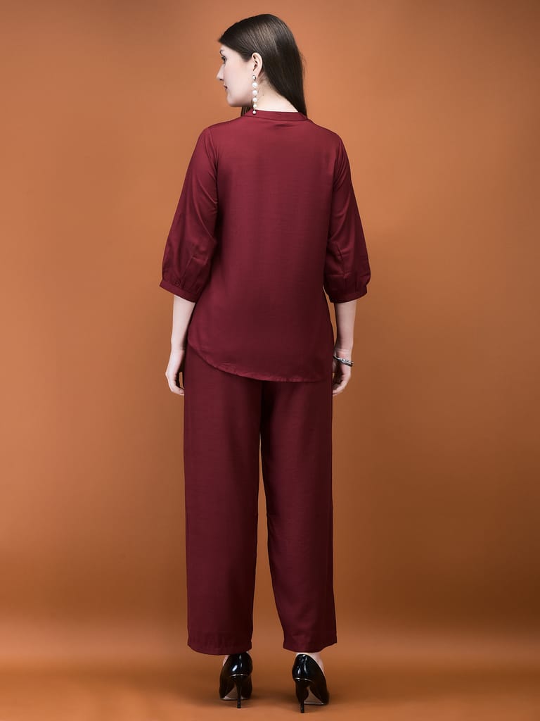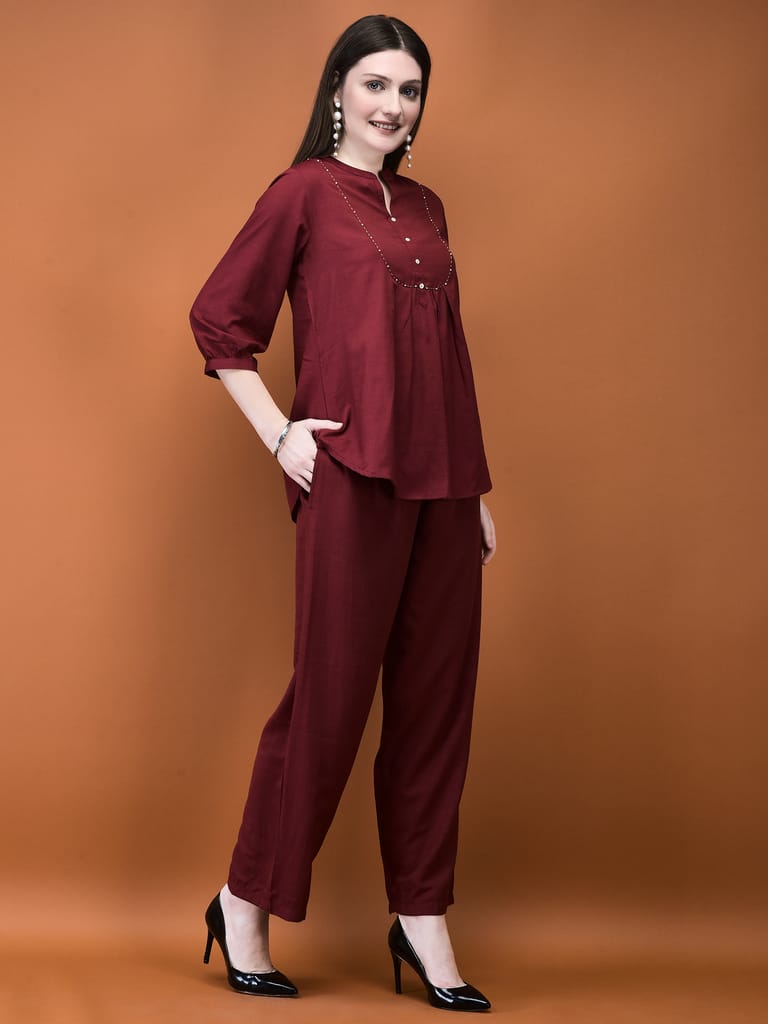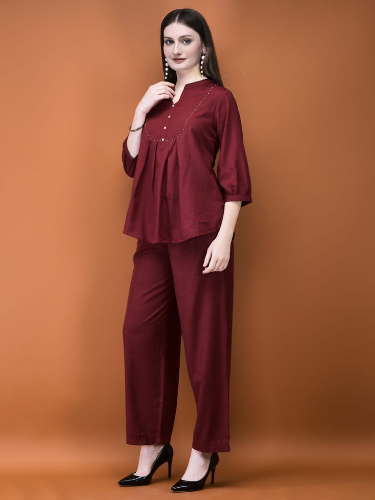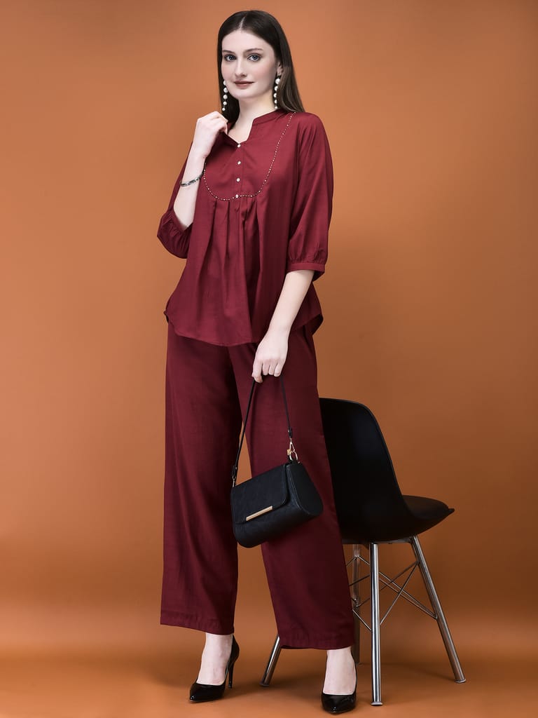 Women Poly Viscose Coral Solid Co-Ord Set