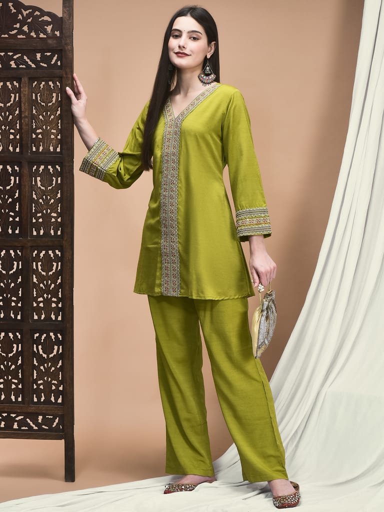 Women Poly Viscose Green Embroidered Co-Ord Set