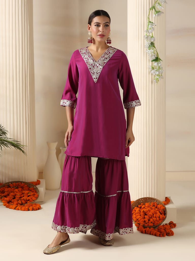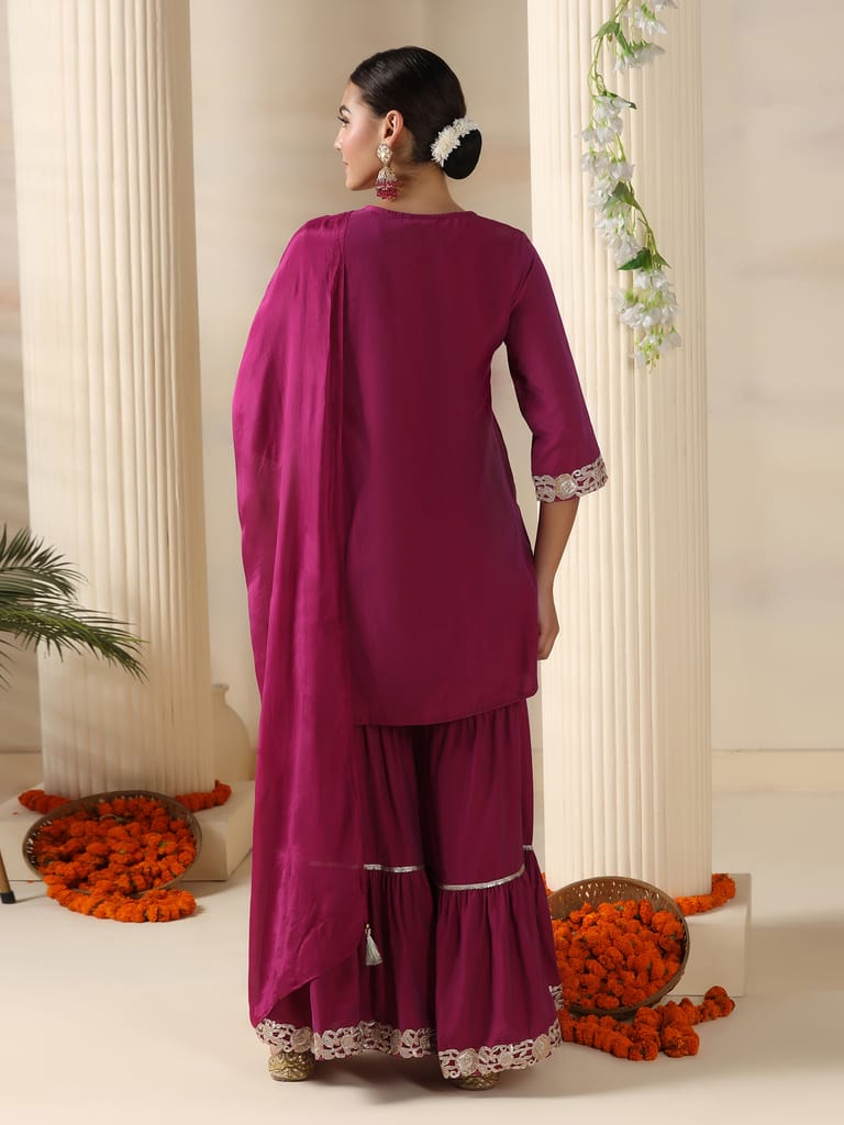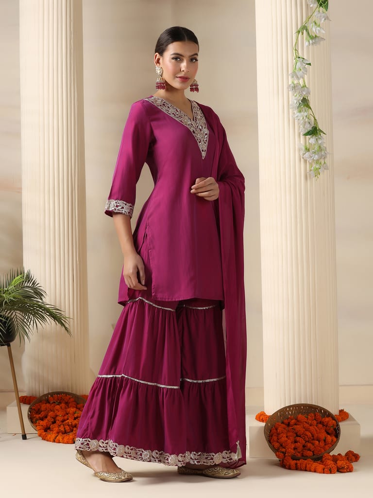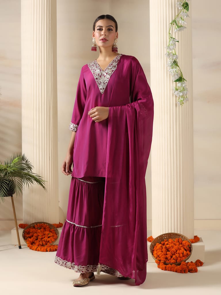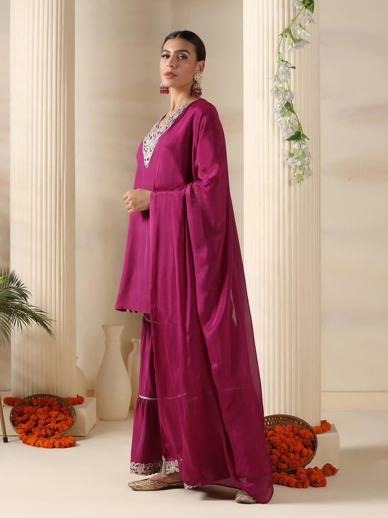 Women Poly Viscose Red Solid Kurta Sharara Dupatta