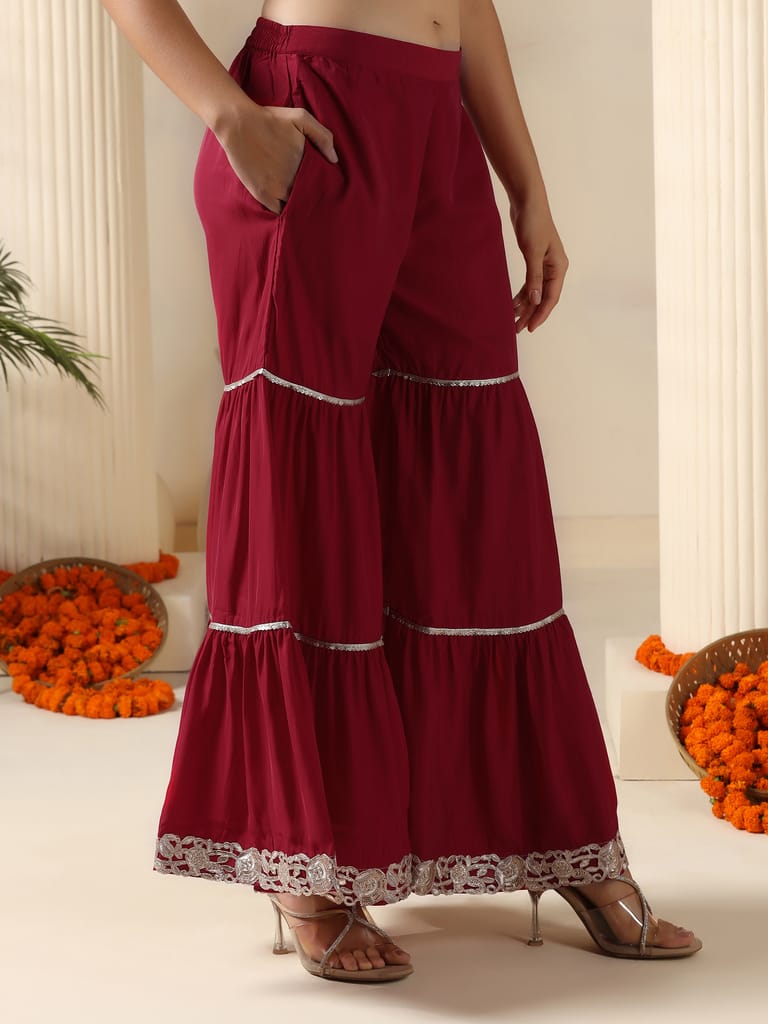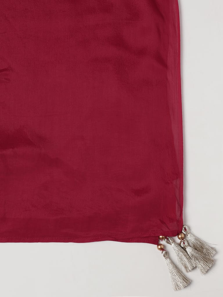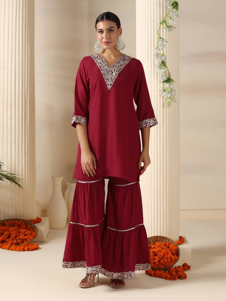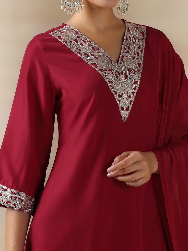 Women Poly Viscose Red Solid Kurta Sharara Dupatta