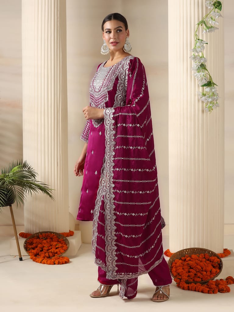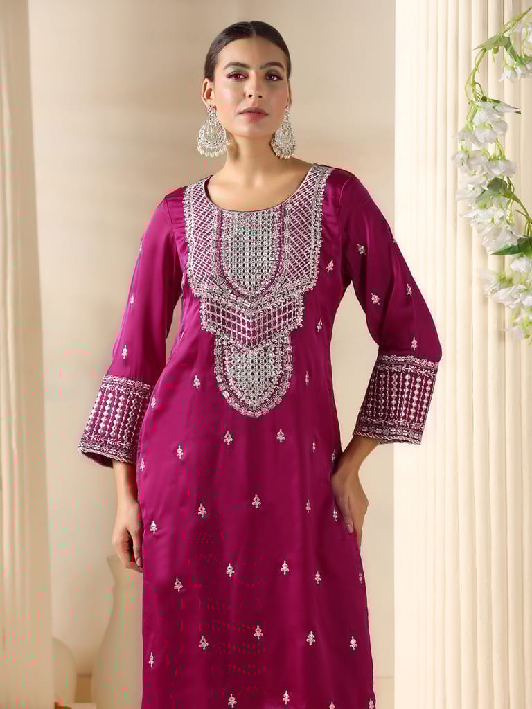 Women Satin Burgundy Embroidered Kurta Comfort Pant Dupatta