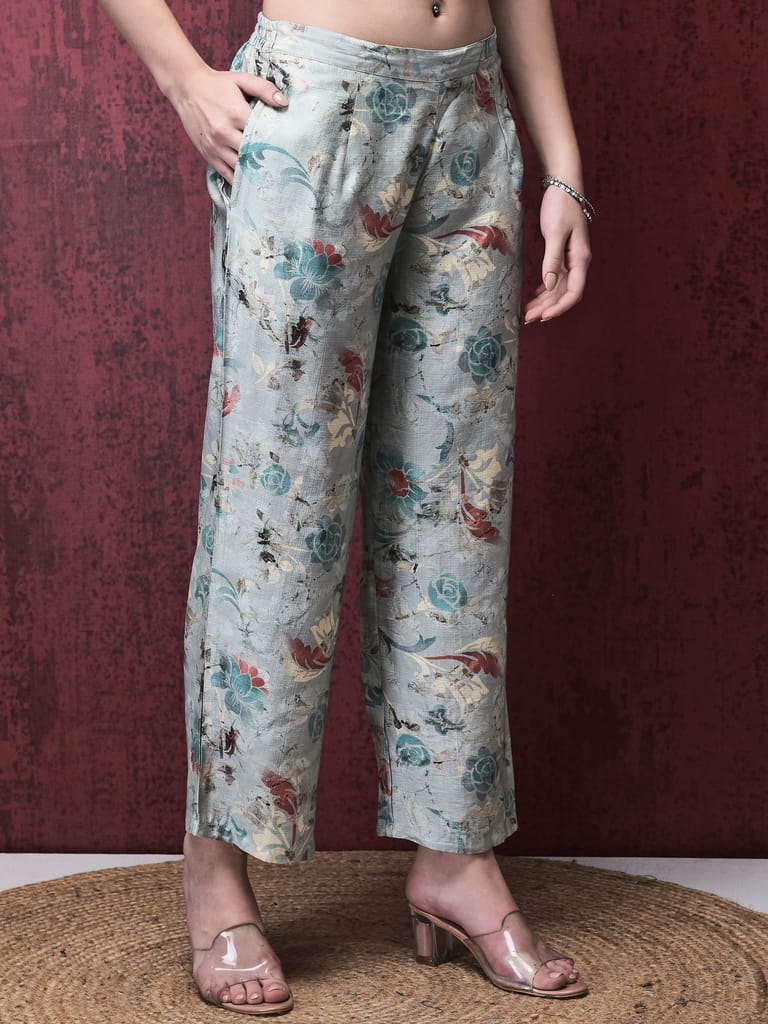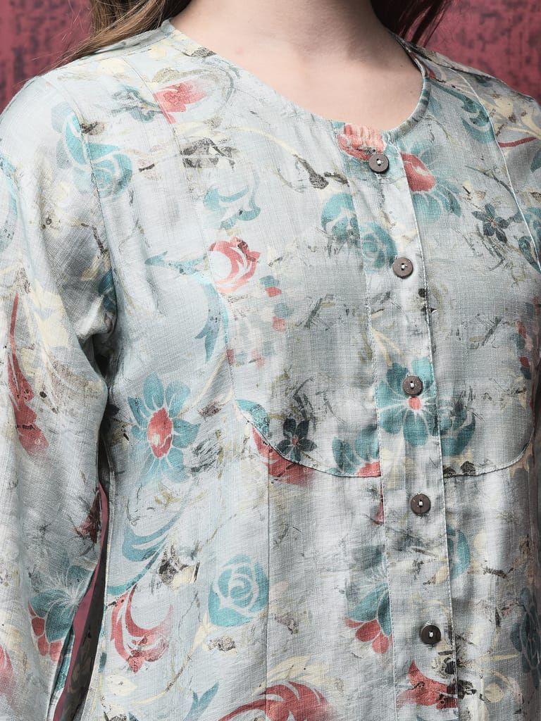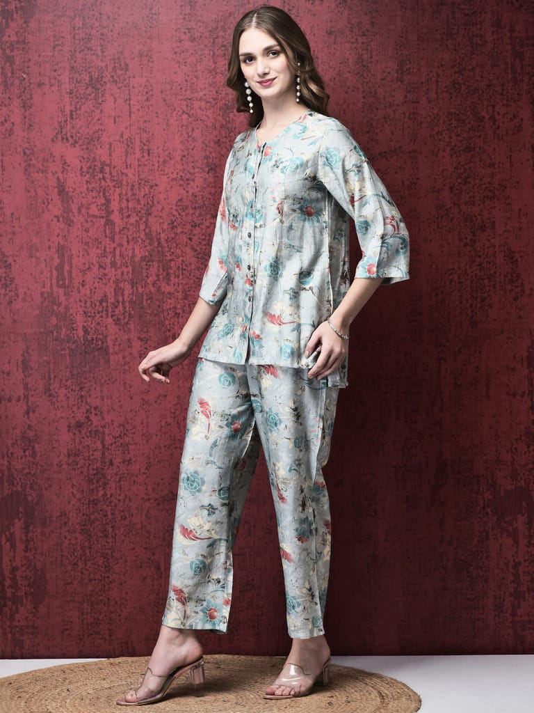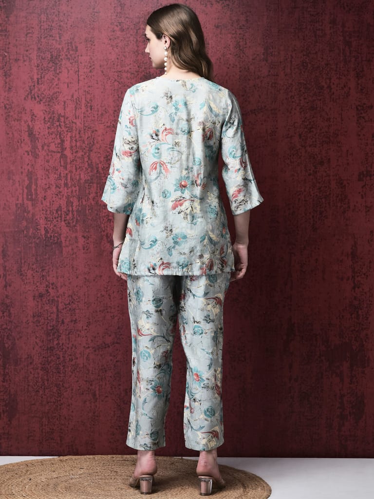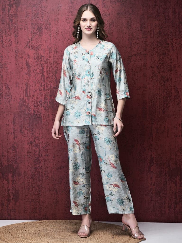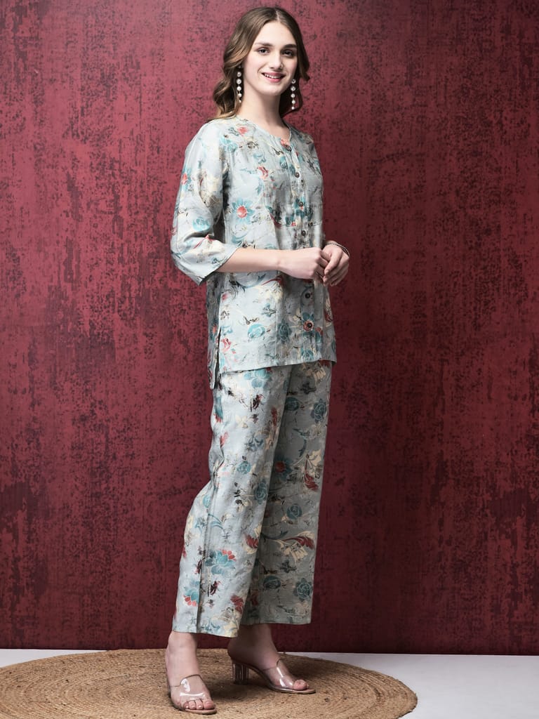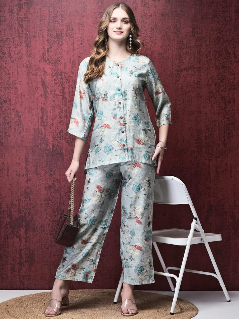Women Silk Blue Floral Print Co-Ord Set