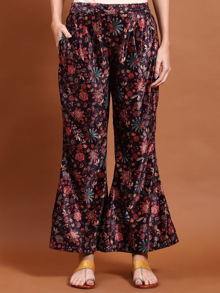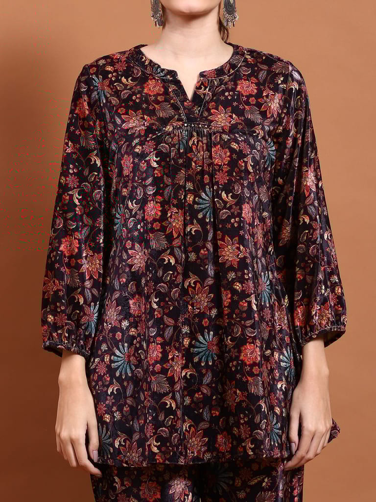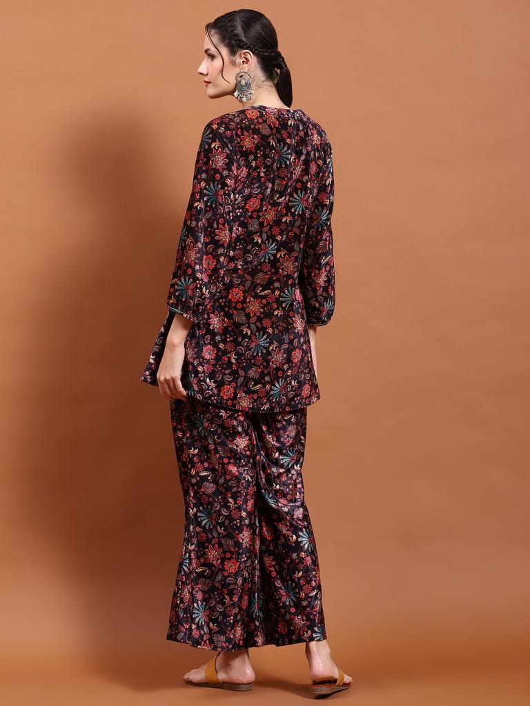 Women Velvet Black Floral Print Co-Ord Set